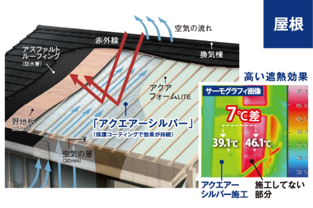 さらに「アクエアーシルバー」などの遮熱材で太陽の赤外線を反射。「断熱(防ぐ)」と「遮熱(反射する)」のWブロックで、夏の厳しい日差しから家を守ります。