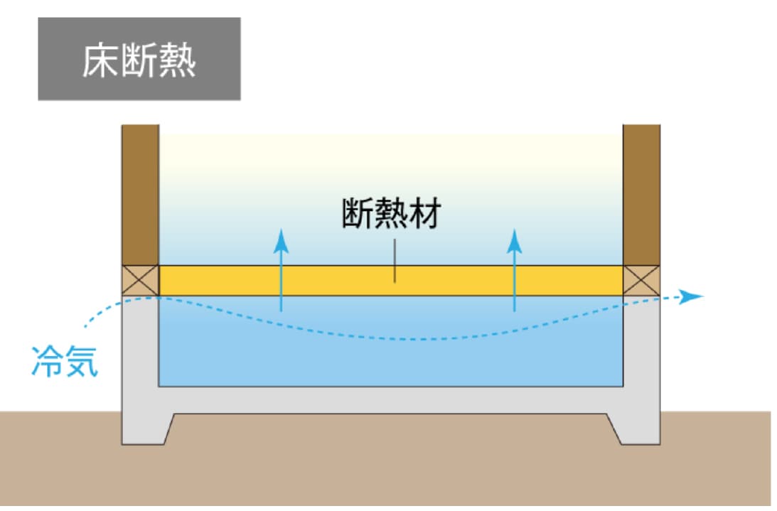 一般的な「床断熱」は床下空間が外気に晒されるため、冷たい外気が床のすぐ下まで迫っています。これが"底冷え"の原因です。