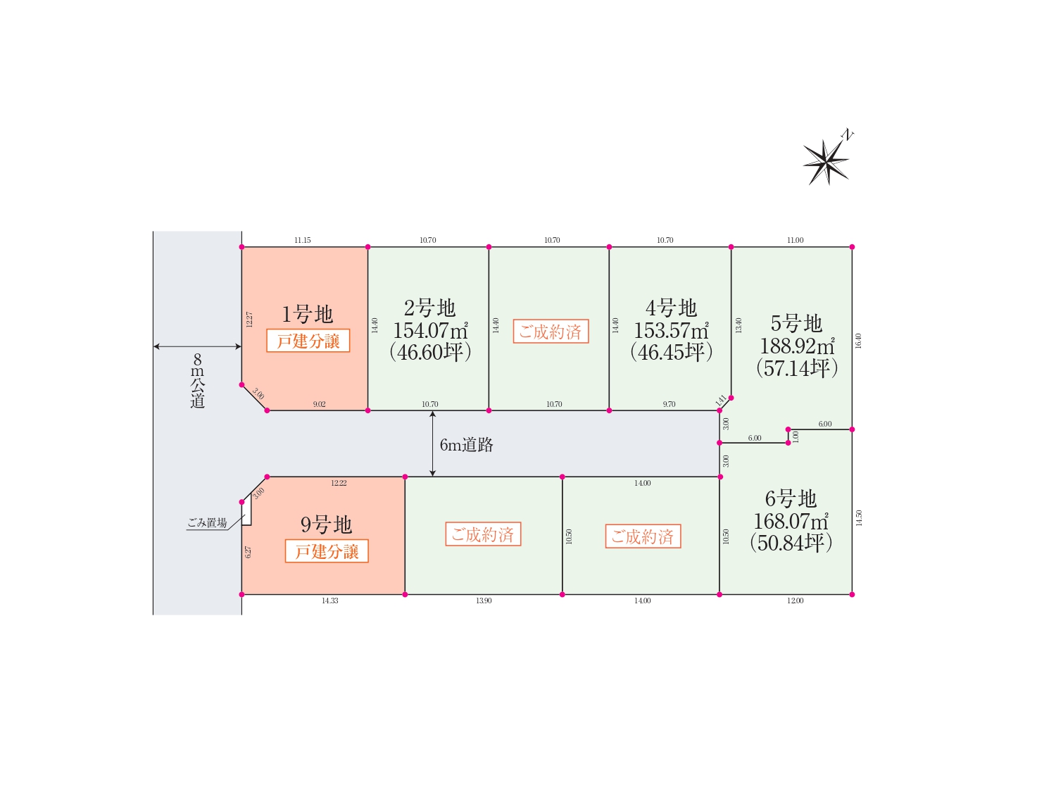 | 土地面積 | 153.57㎡(46.45坪)〜188.92㎡(57.14坪) |