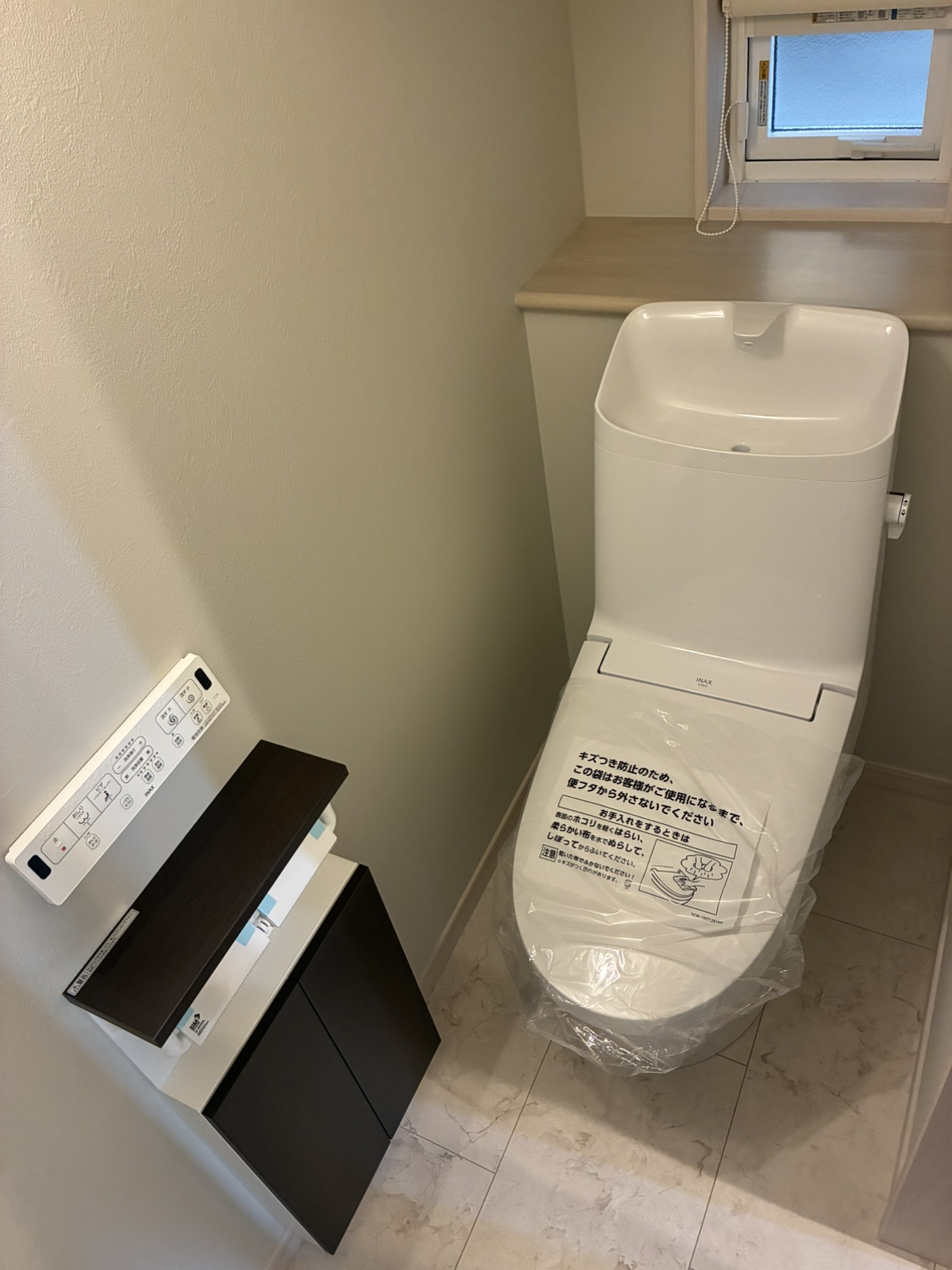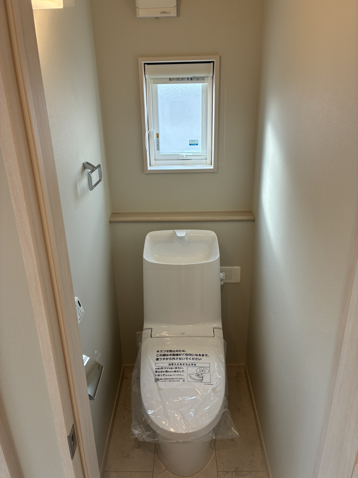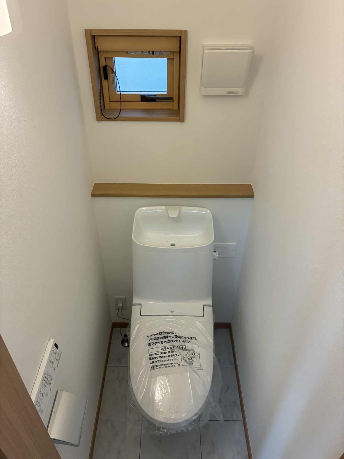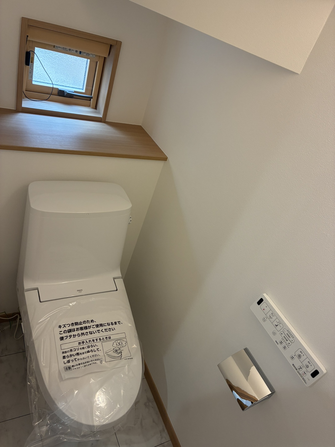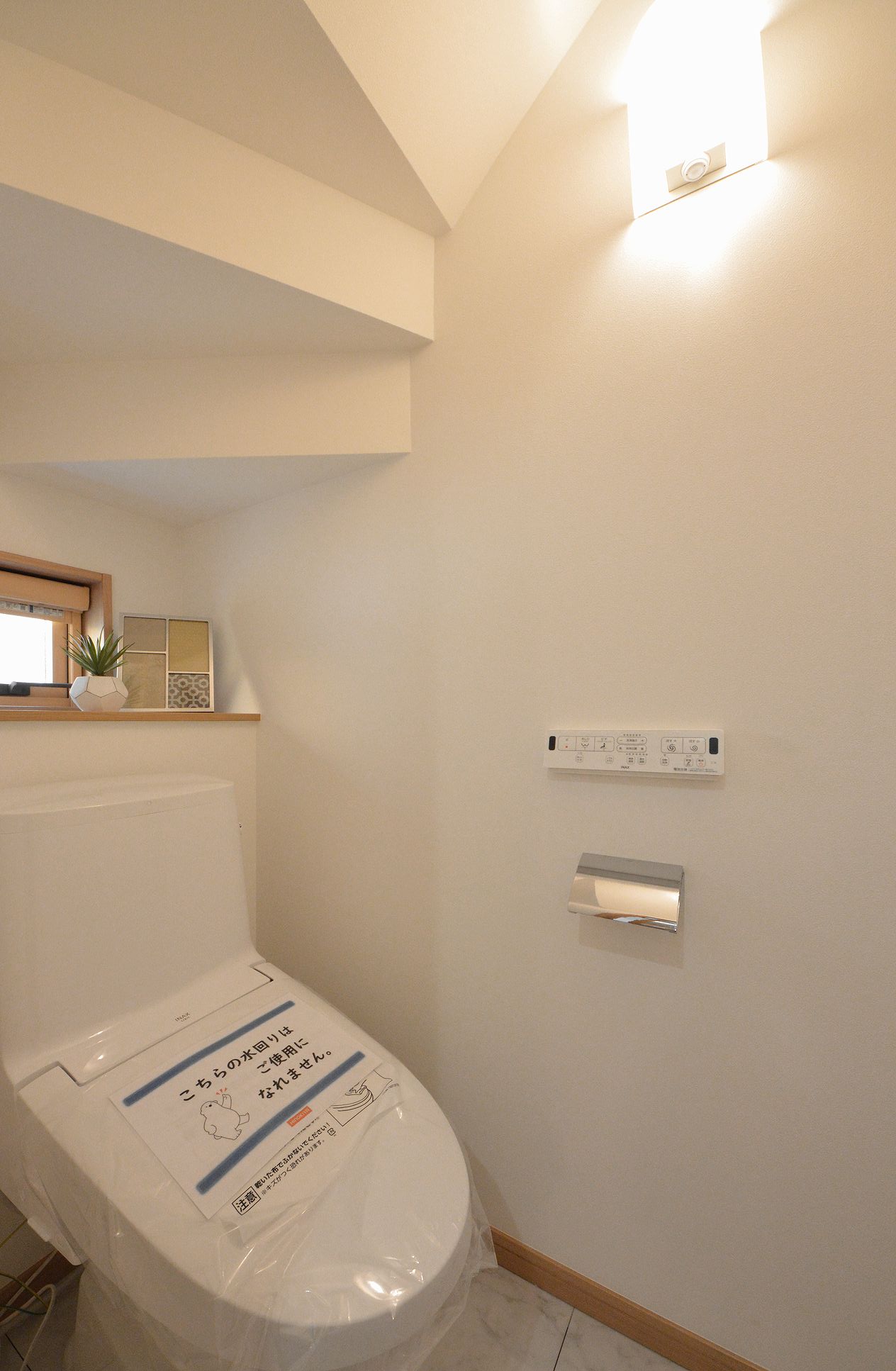 操作のしやすい壁面リモコンを設置した温水洗浄便座付き。1年を通して快適に使用できます。窓があり自然換気が可能です。