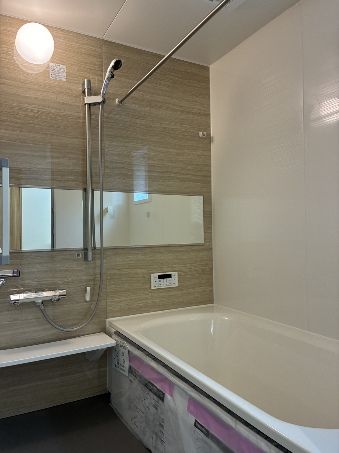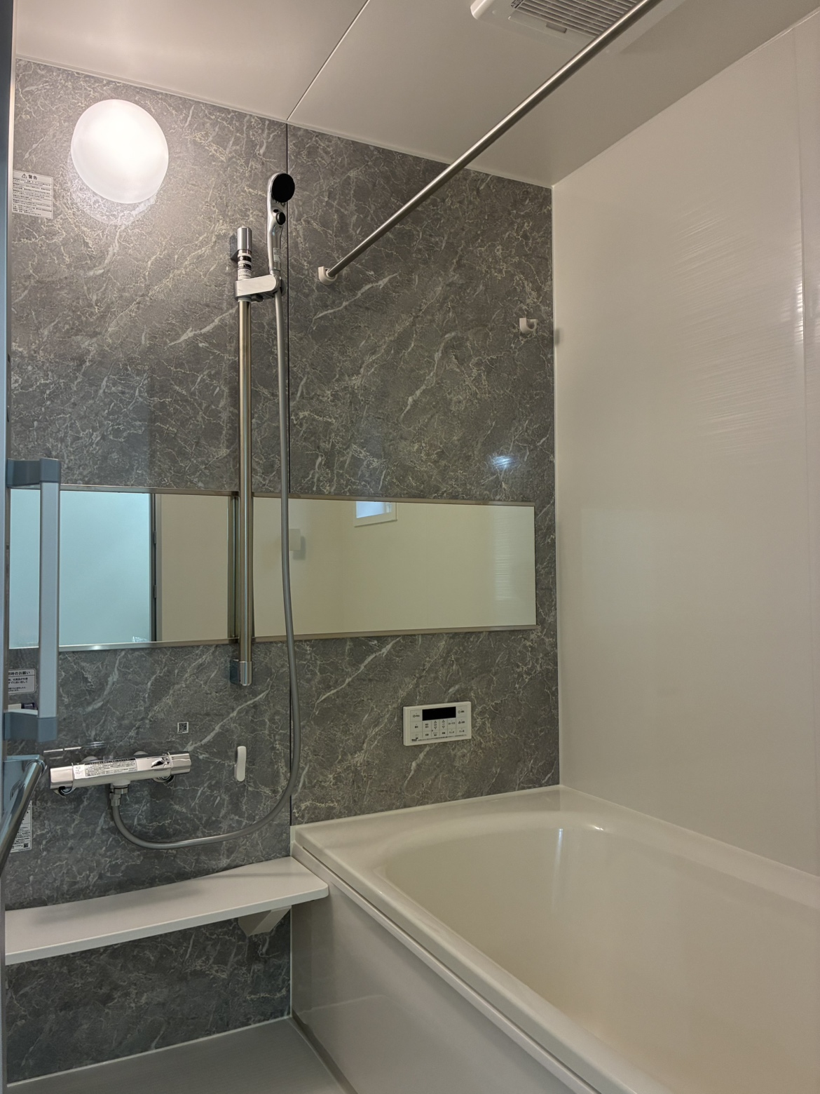 石目調のアクセントパネルが落ち着いた雰囲気の浴室です。浴室乾燥機を備えており、深夜や雨の日でも、すっきりと洗濯物を乾かせます。