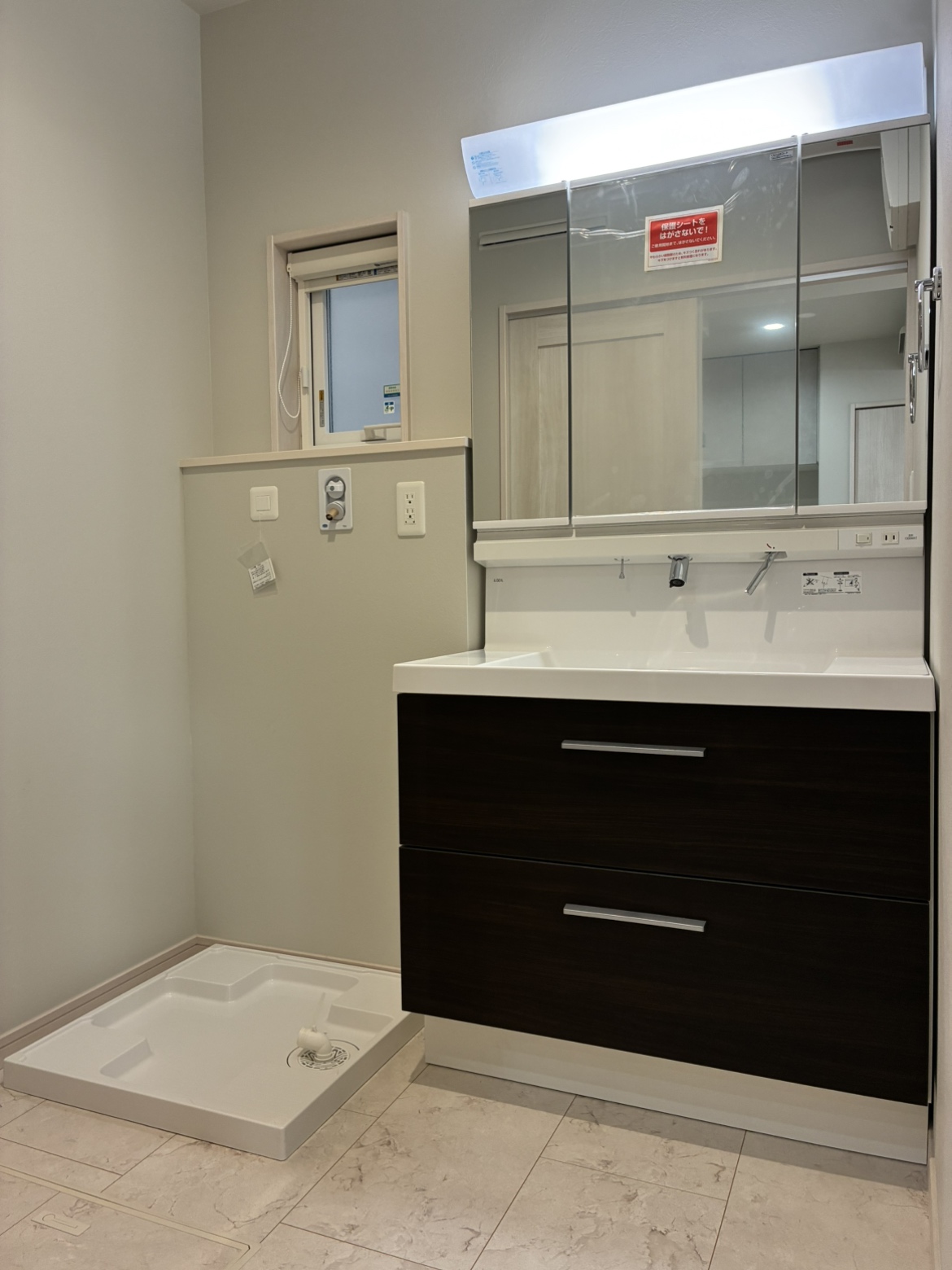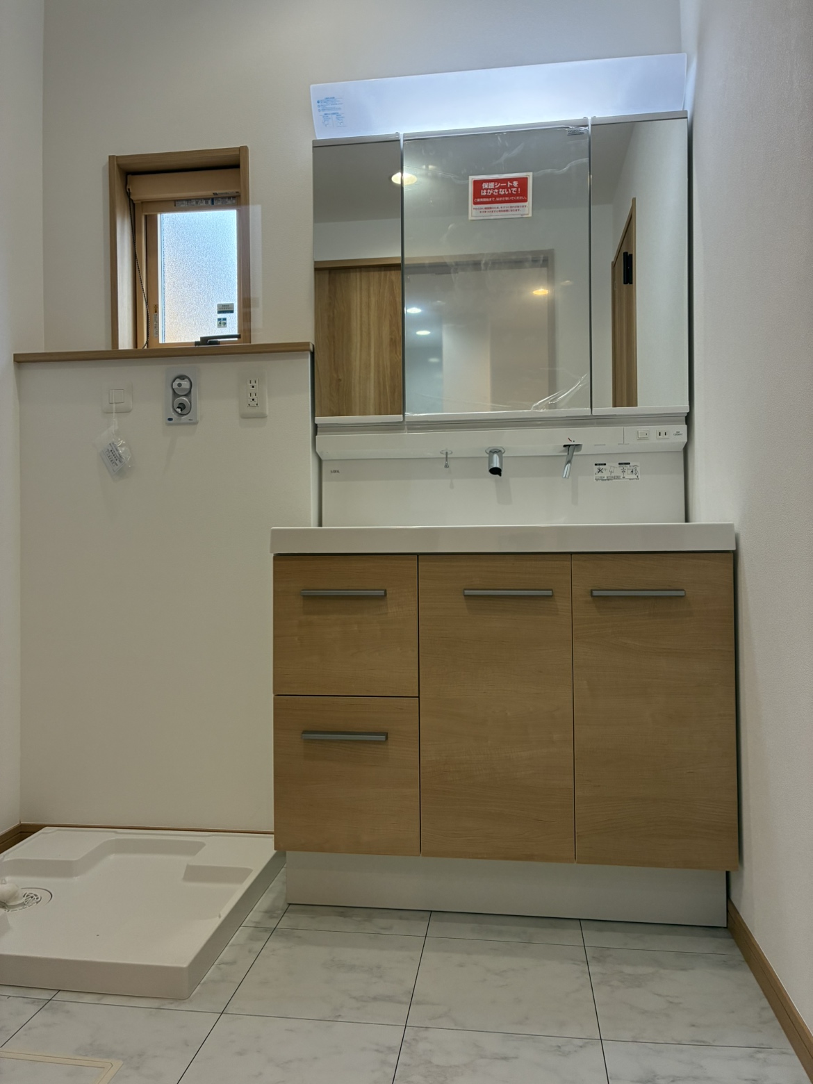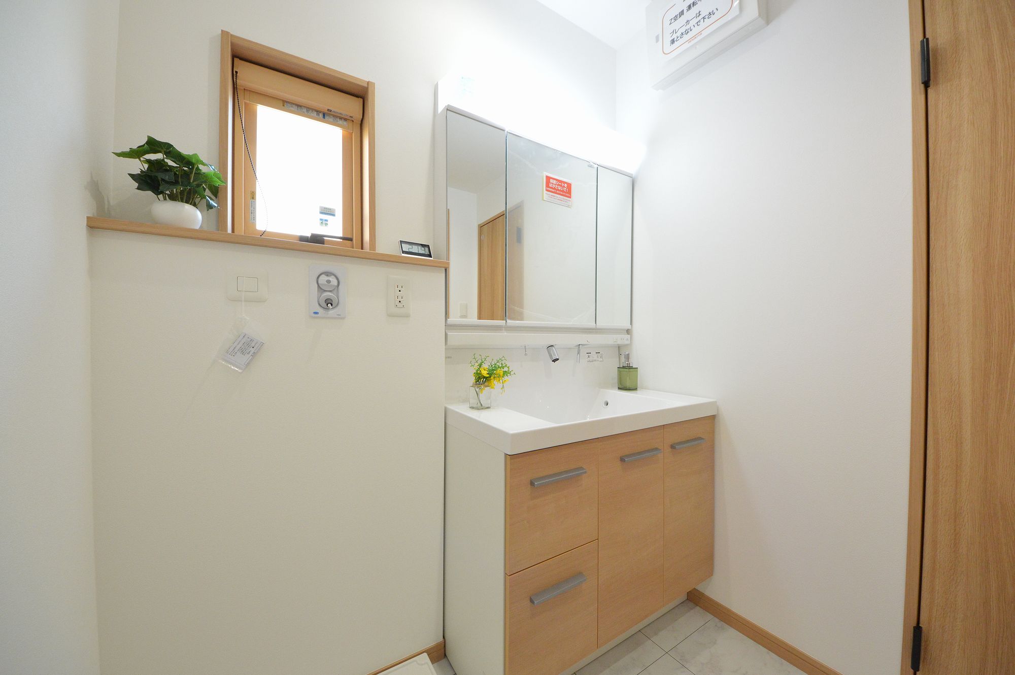 ヘアセットの確認がしやすい3面鏡付きの洗面化粧台です。手洗いボウル下に収納があり、タオルや洗面用品などを保管するのに重宝します。