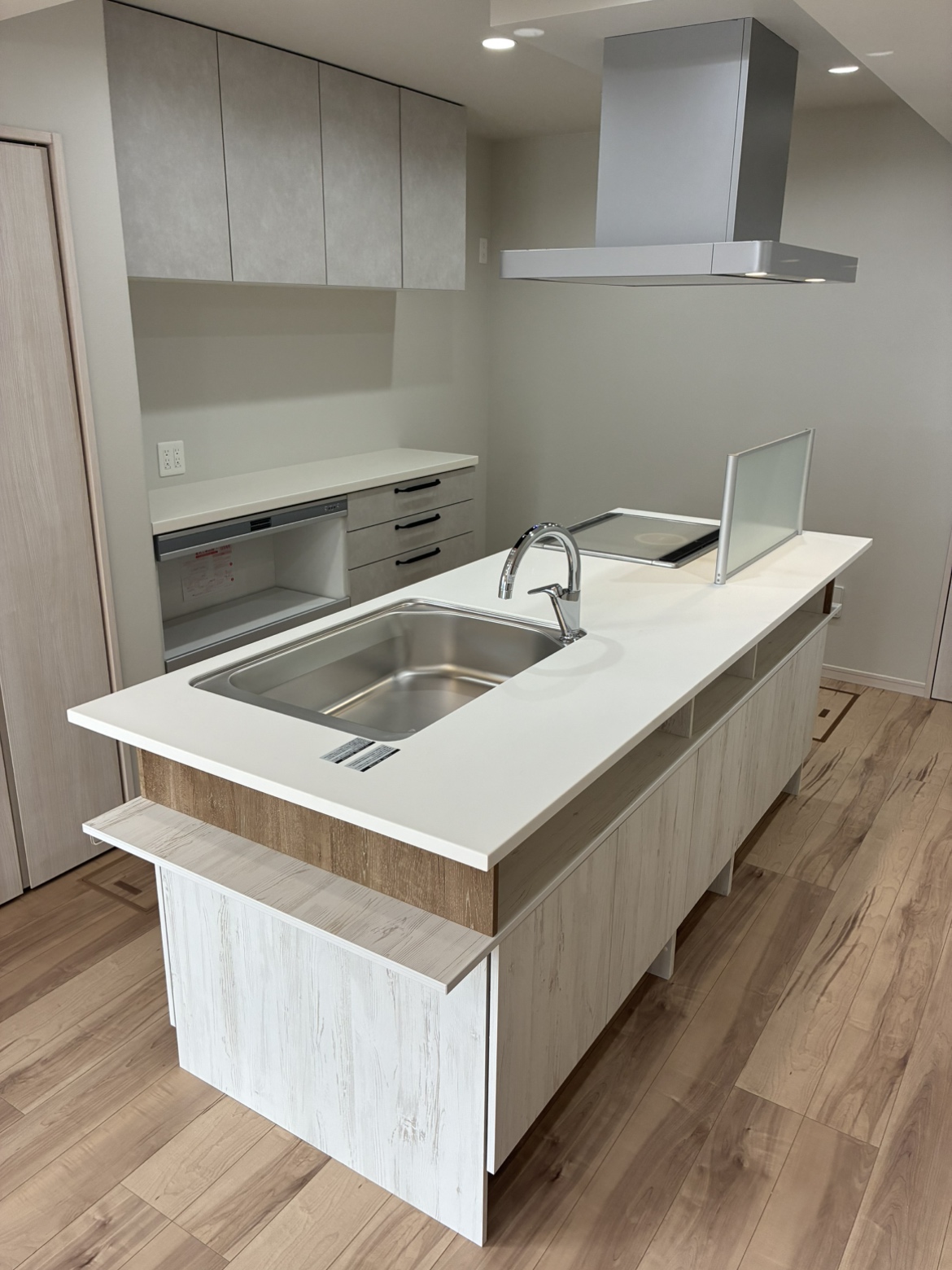 スタイリッシュなデザイン水栓や食器洗乾燥機を備えた、アイランドキッチン。フラットでお手入れがしやすいIHクッキングヒーターです。