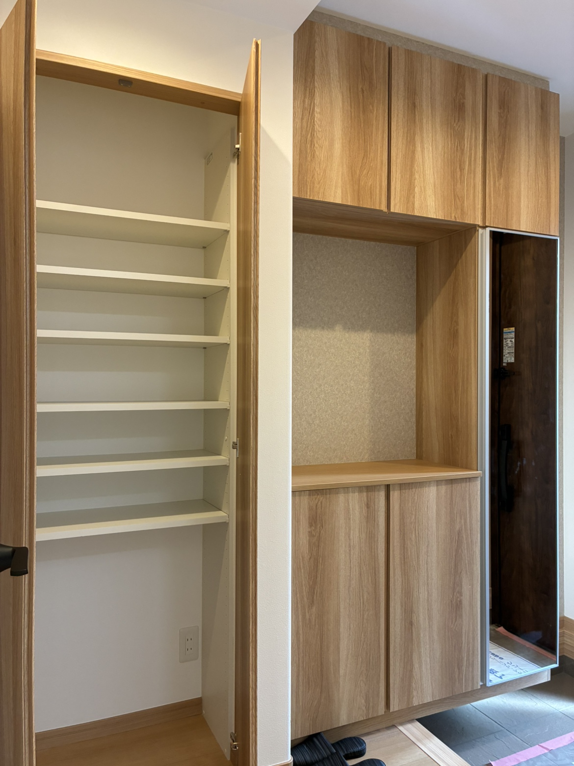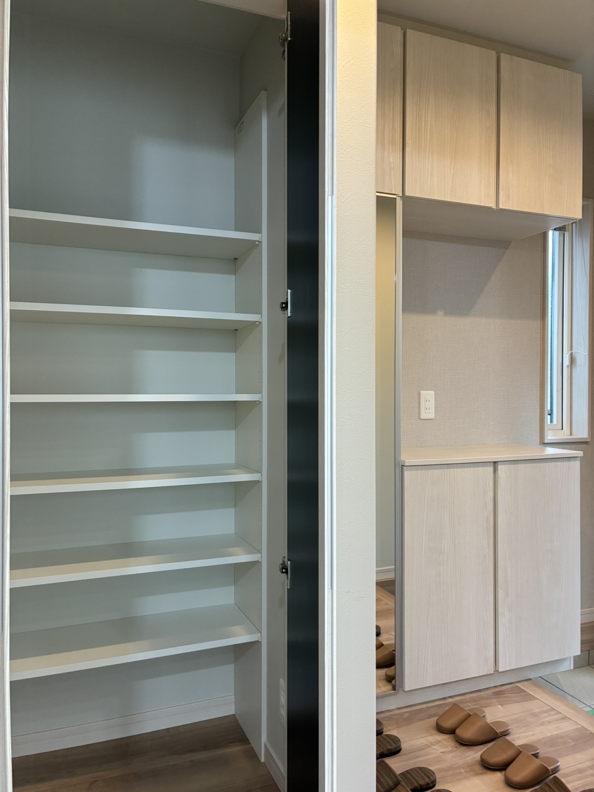 玄関には玄関収納のほか、ホール部分にも可動棚付きの収納有り。コンセント付きで、掃除機や電動自転車のバッテリーの充電などにも重宝します。