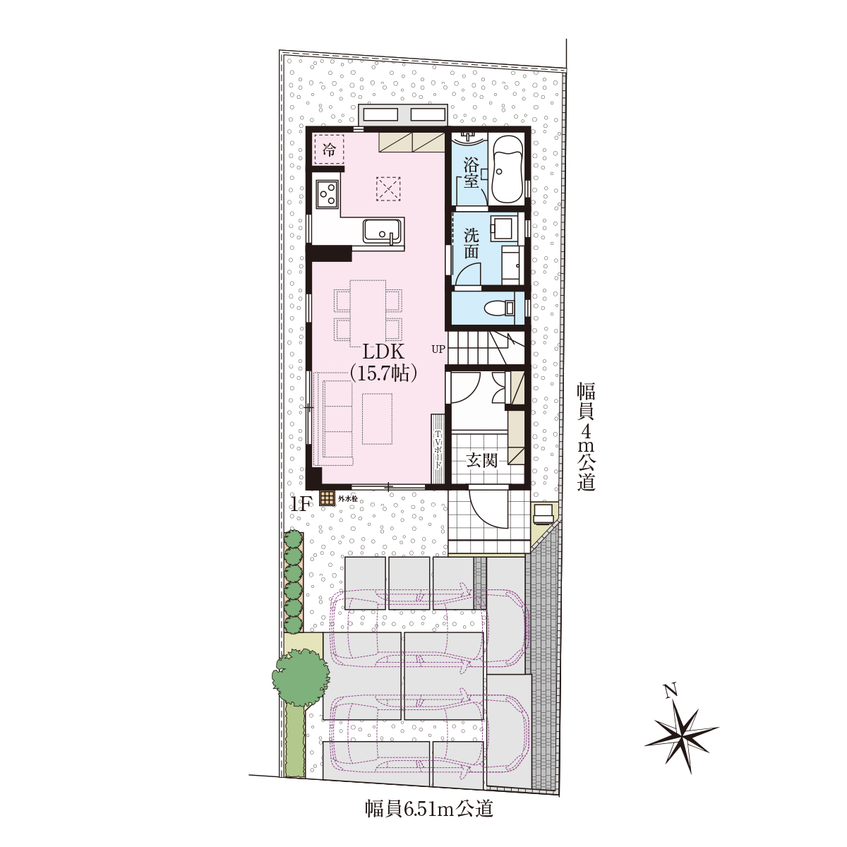 エアコンの設置が不要な、全棟・全館空調搭載住宅です。敷地内には、それぞれ2台分のカースペース(車種による)を備えており、充実したマイカーライフも楽しめます。