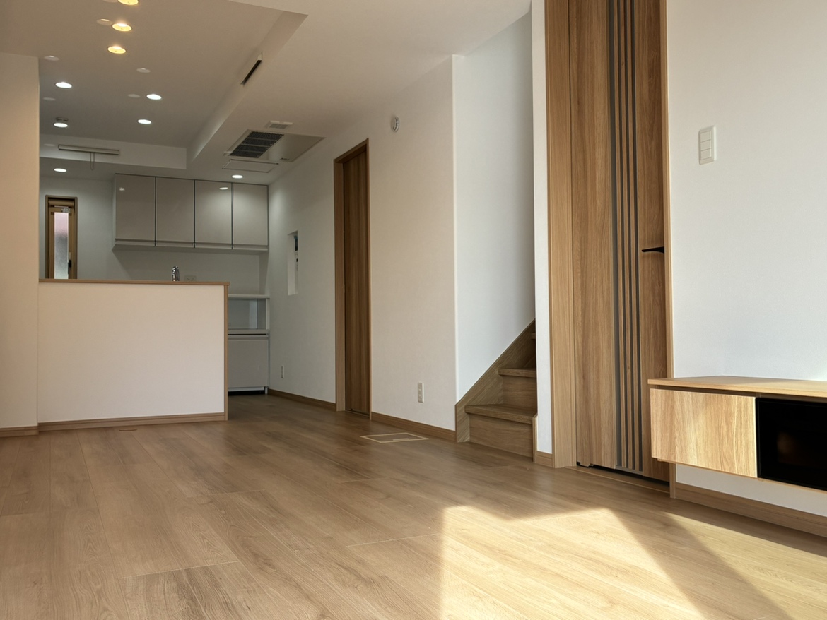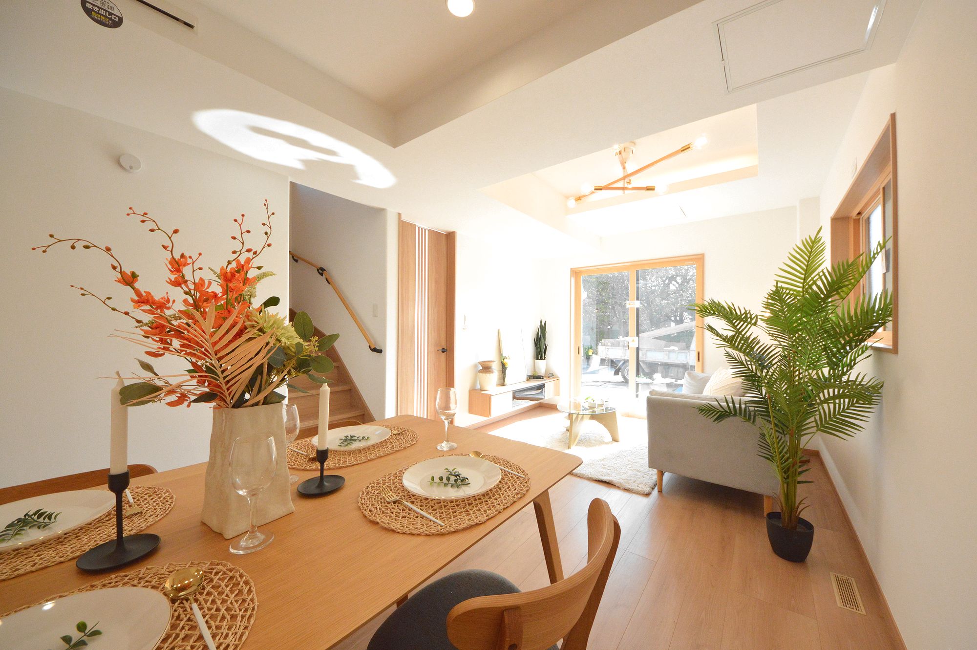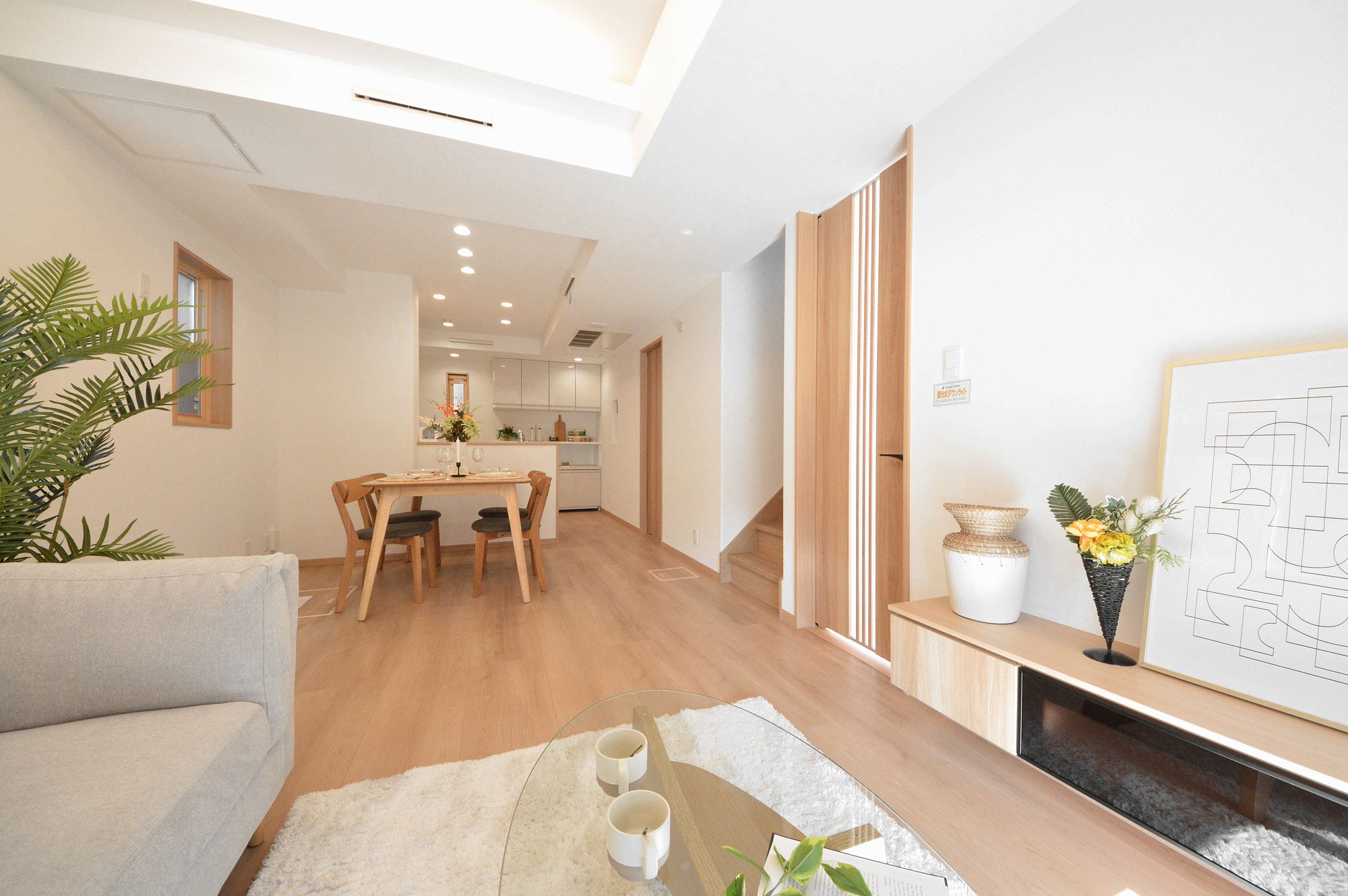 たっぷりと陽光が差し込む約15.7帖のLDKです。木の温もりを感じられるナチュラルテイストの内装。ご家族とコミュニケーションがとりやすい、リビング階段と対面式キッチンです。