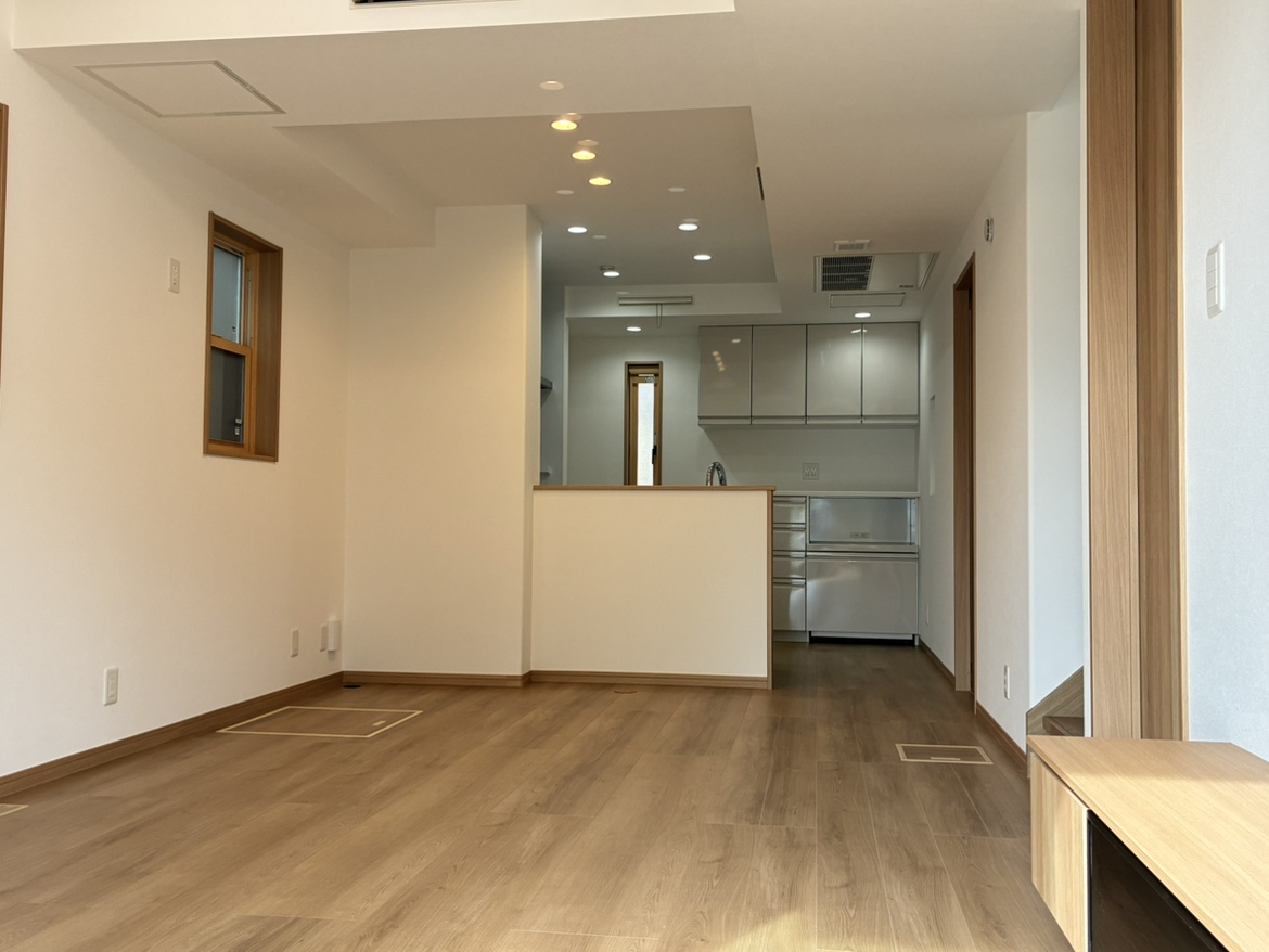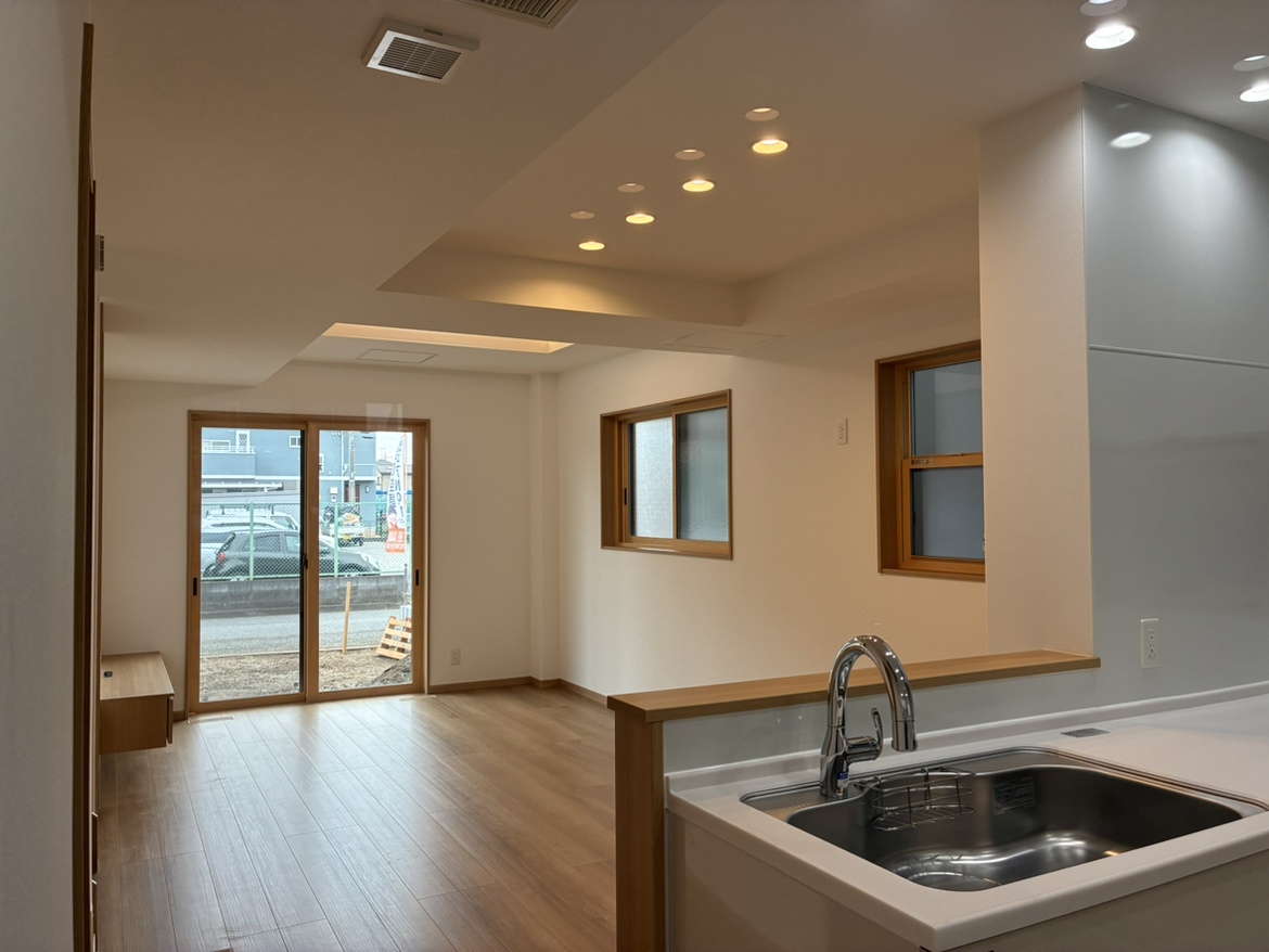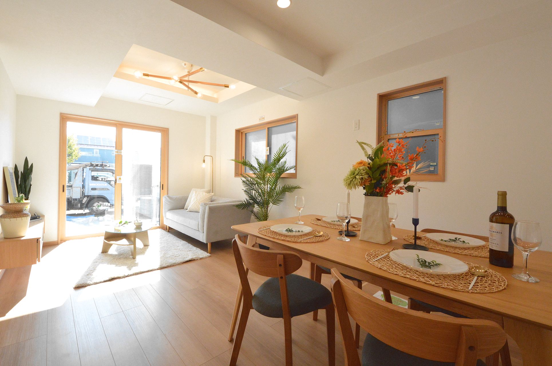 たっぷりと陽光が差し込む約15.7帖のLDKです。木の温もりを感じられるナチュラルテイストの内装。ご家族とコミュニケーションがとりやすい、リビング階段と対面式キッチンです。