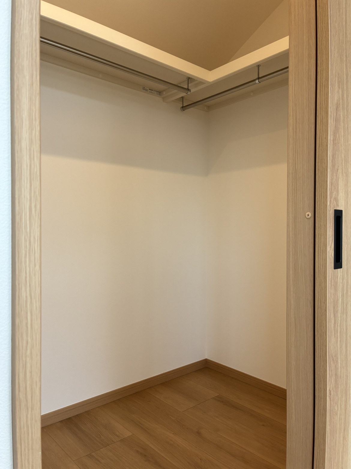約6.0帖の洋室には、約2.2帖のWICを備えています。ハンガーパイプと棚板付で、衣類は掛けて、小物は棚の上にとたっぷり収納できそうです。
