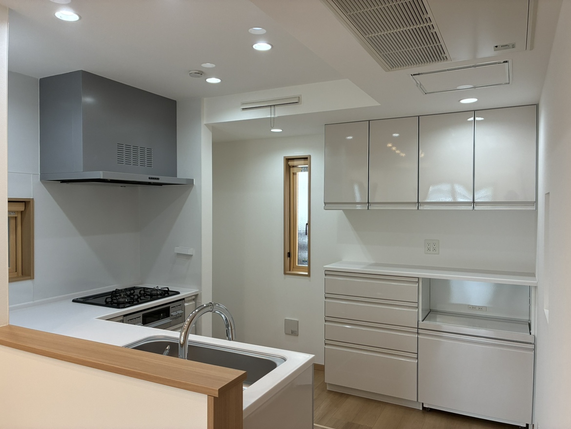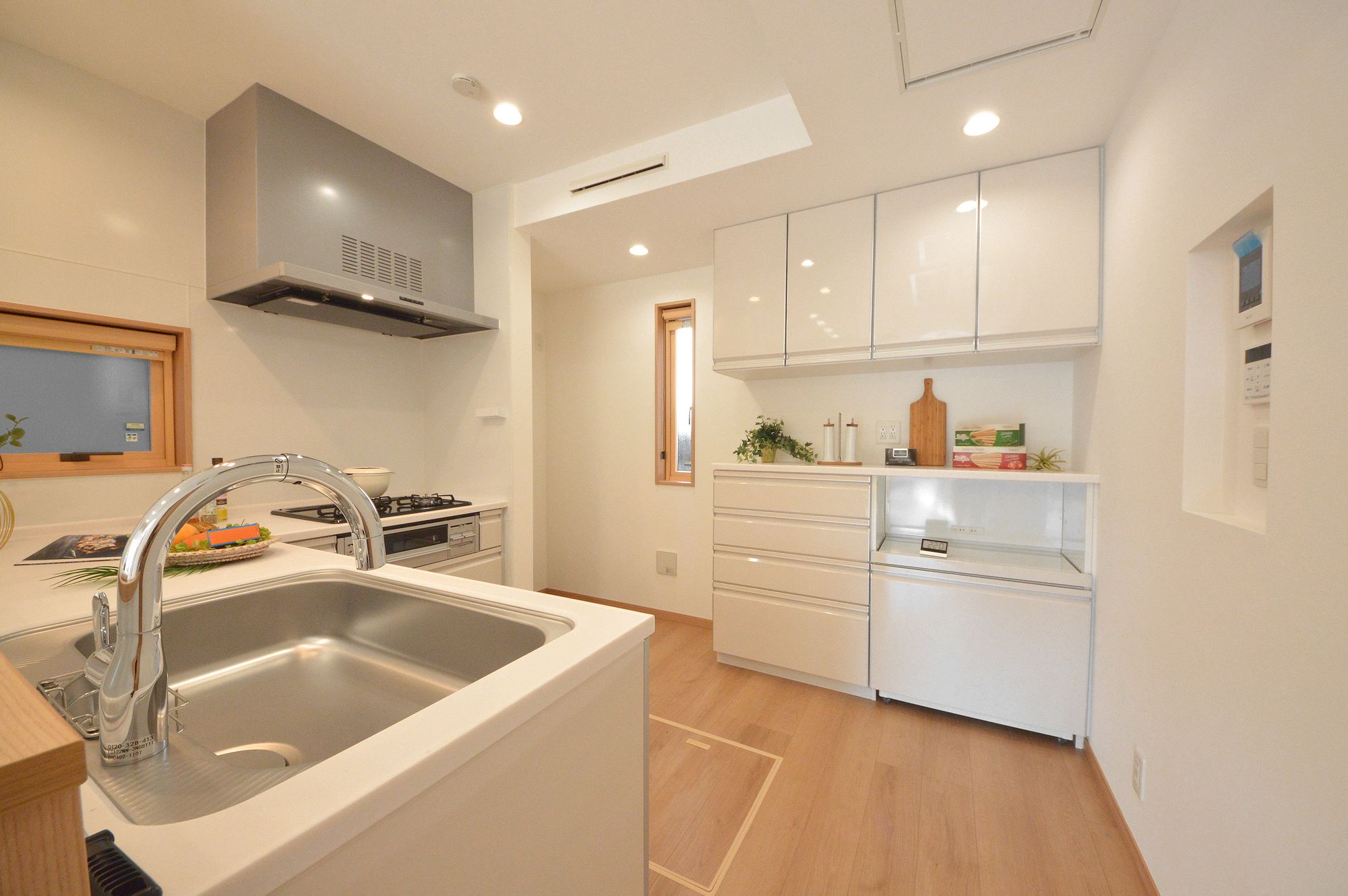 キッチン背面にカップボードを備え付けています。収納もあり、調理家電や調理器具・お鍋・保存食などをたっぷりと保管できます。