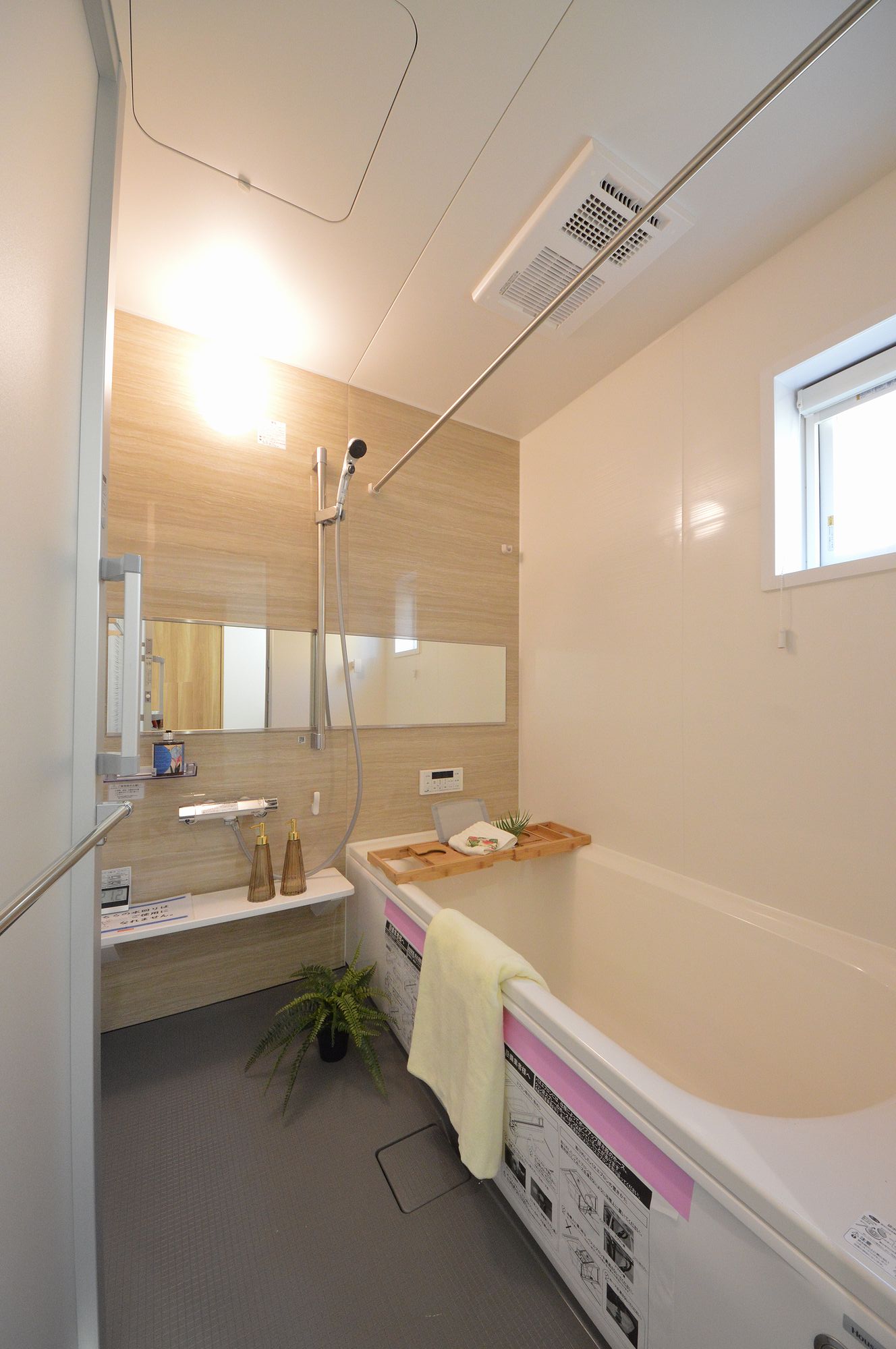 ゆったりと足を伸ばして、1日の疲れを癒やしていただけます。浴槽に浸かりながらフェイスケアが行えるワイドミラー付き。窓を設置しているため、自然換気も行えます。