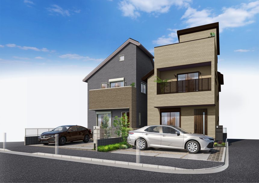 敷地面積35坪超、角地を含む全2棟が誕生。前面道路幅は6mの公道で、車の駐車もスムーズに行える広さです。各棟2台分の駐車スペースがあります。(車種による)