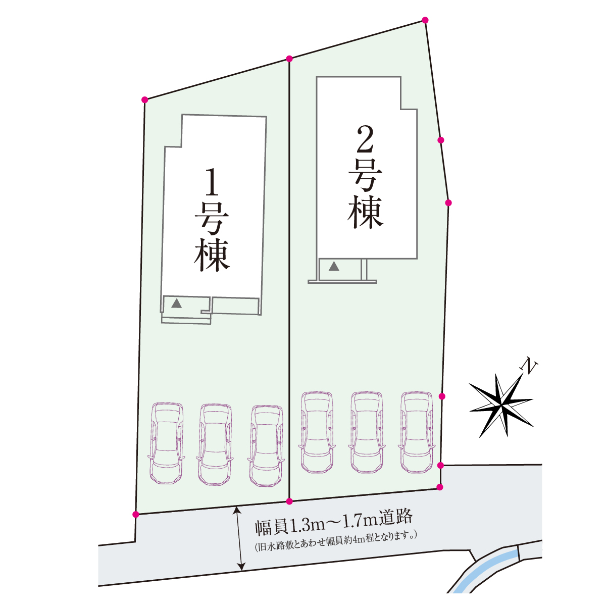 | 接道状況 | 南側1.3m~1.7m(旧水路敷とあわせ幅員約4m程となります。) |