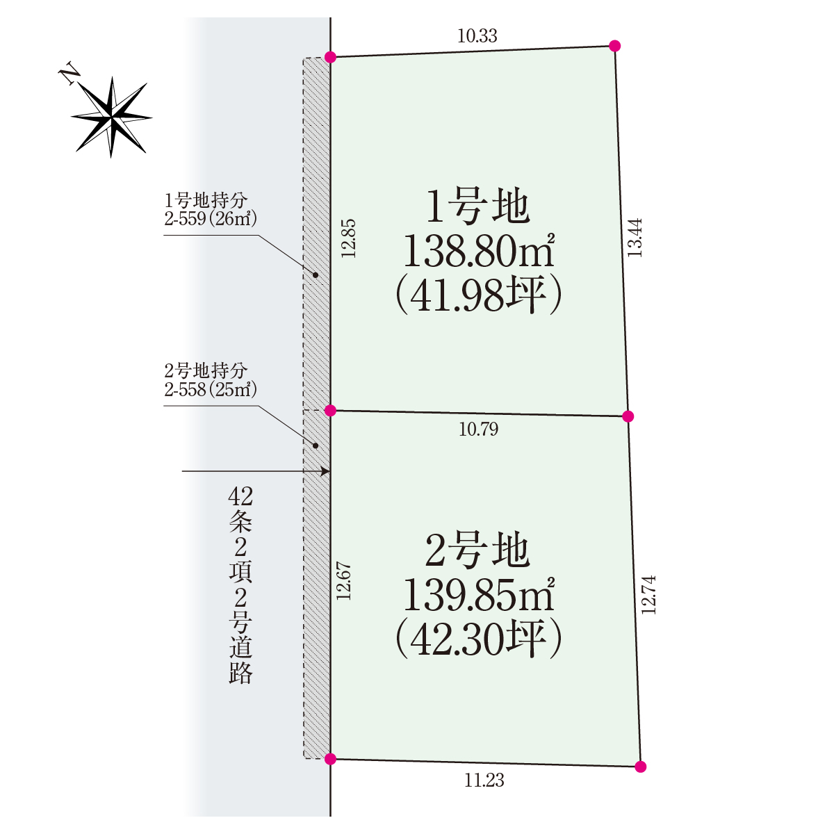 私道・その他共有持分 | 1号地:43 条2項但し書き道路※持分2-559(26㎡)・2号地:43条2項但し書き道路※持分2-558(25㎡ ) |