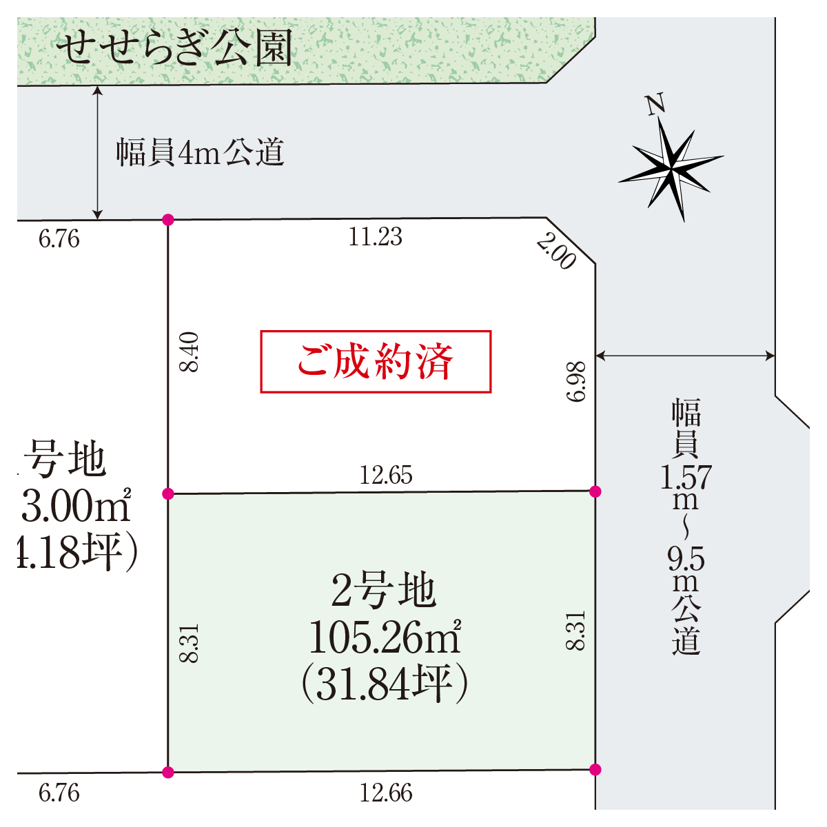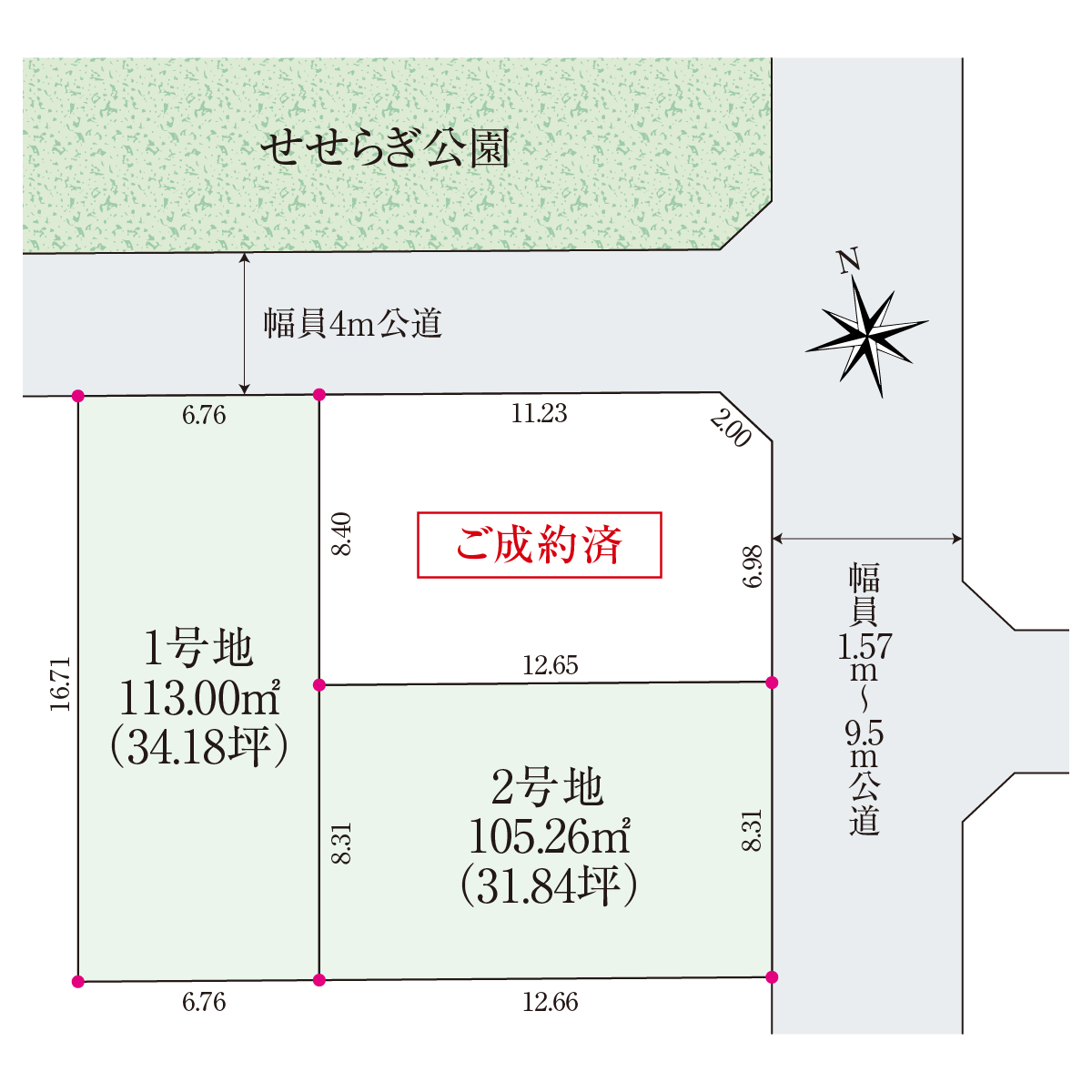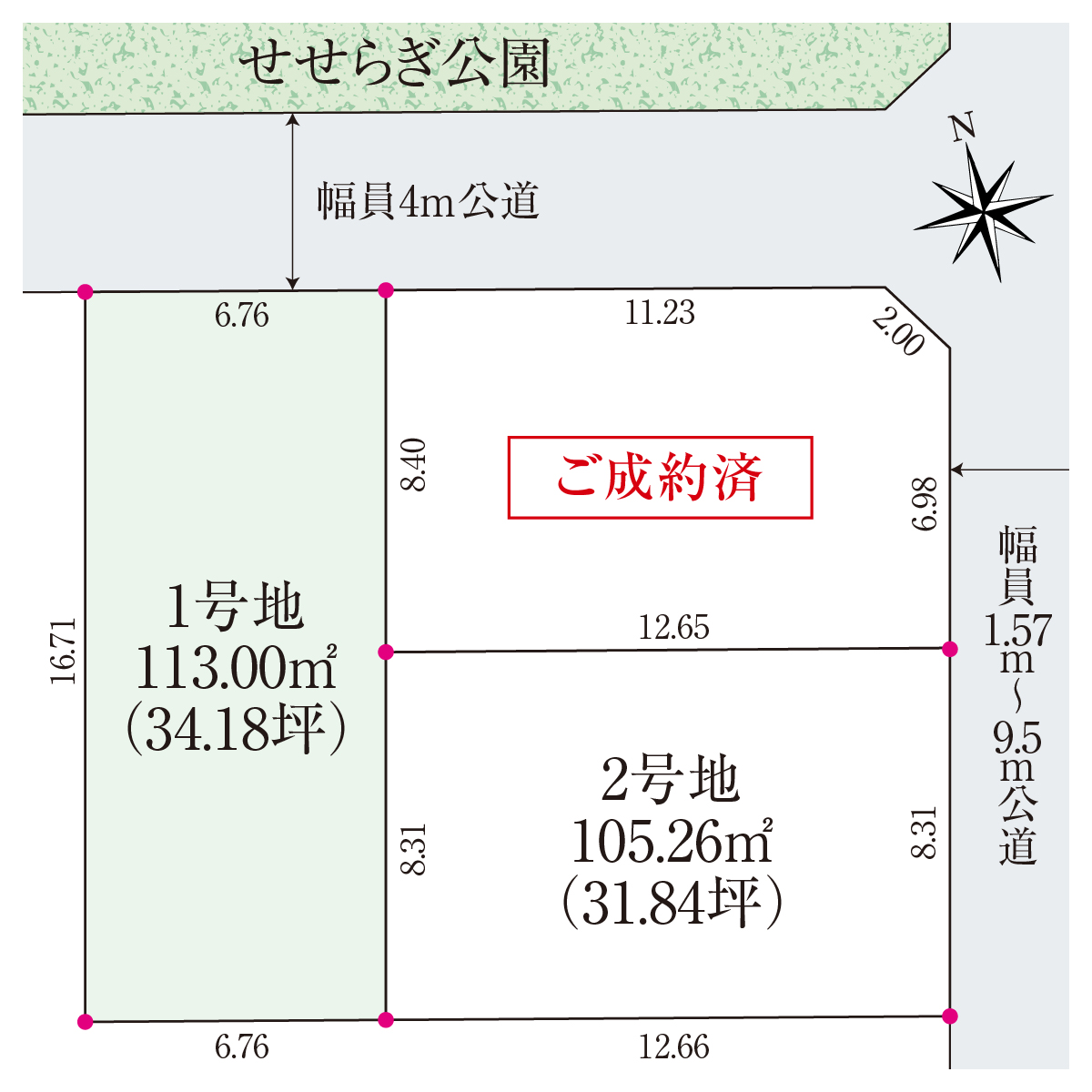 東側約1.57m~9.5m、北側約4mの公道に面した区画。敷地を有効活用できる整形地です。公園が道路の向かい側にあり、子育て世帯にはうれしい立地。