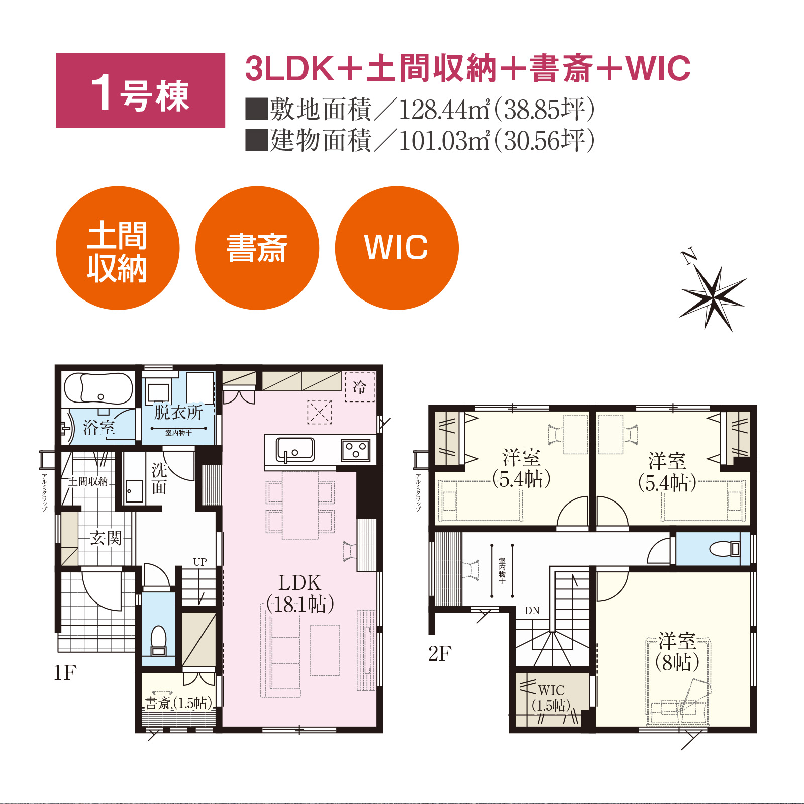 | 1号棟 | 3LDK+土間収納+書斎+WIC | 128.44 | 38.85 | 101.03 | 30.56 | 3,980万円 | ||