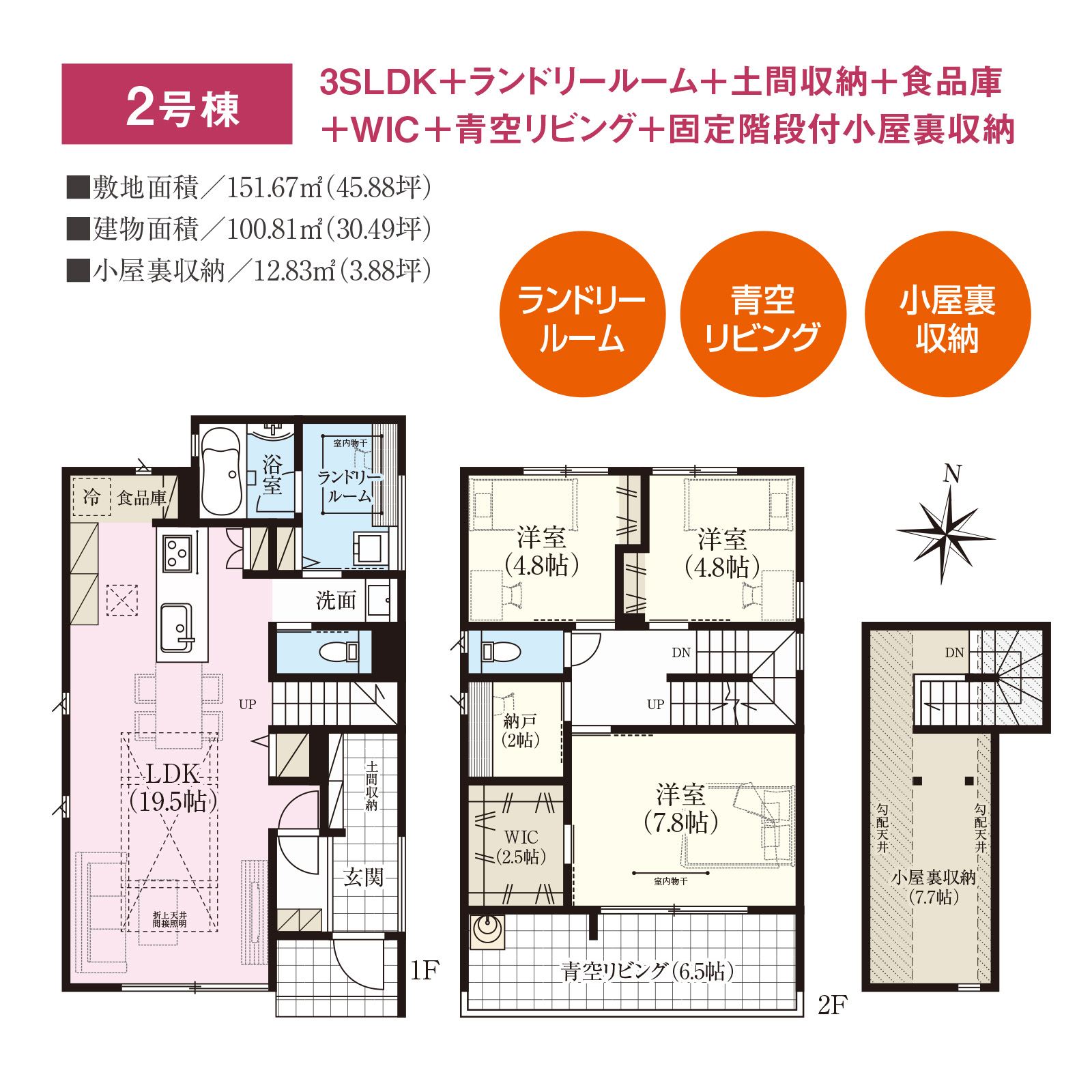| 2号棟 | 3LDK+ランドリールーム+土間収納+食品庫+WIC+青空リビング+小屋裏収納 | 151.67 | 45.88 | 100.81 | 30.49 | 5,590万円 | ||