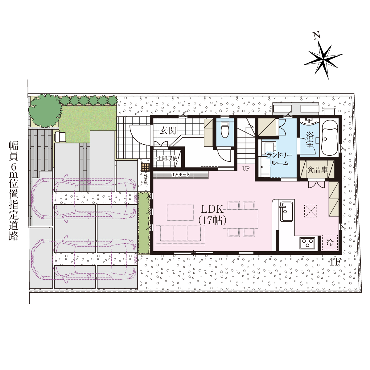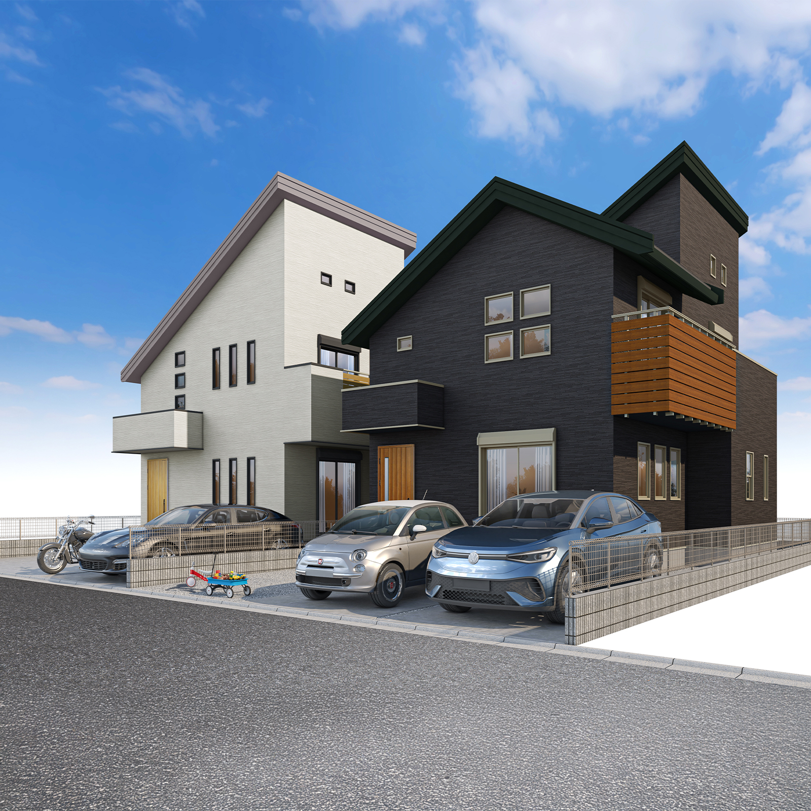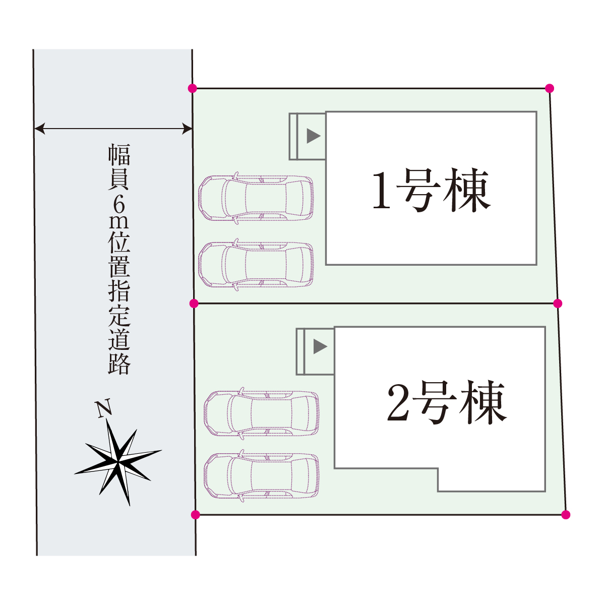 全2棟!西側の前面道路の幅員は約6.0m。ゆとりがあるので、お車の駐車やすれ違いもスムーズです。駐車スペースは2台分ご用意しています(車種による)。