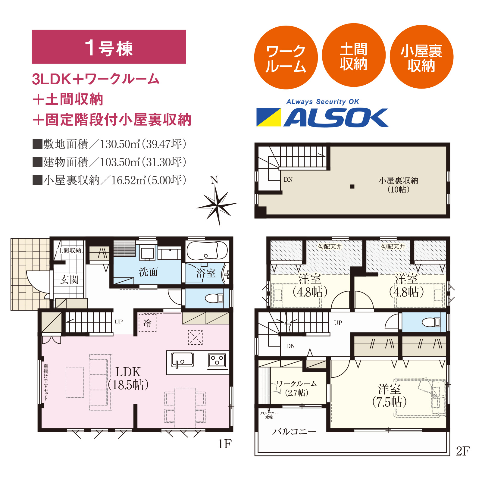 | 間取り | 3LDK+ワークルーム+土間収納+固定階段付小屋裏収納 |