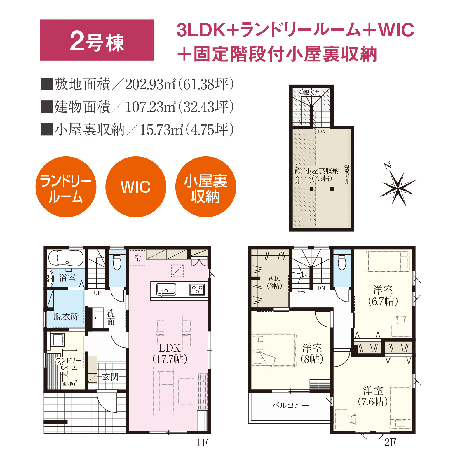 | 2号棟 | 3LDK+ランドリールーム+WIC+固定階段付小屋裏収納 | 202.93 | 61.38 | 107.23 | 32.43 | 4,480万円 | ||