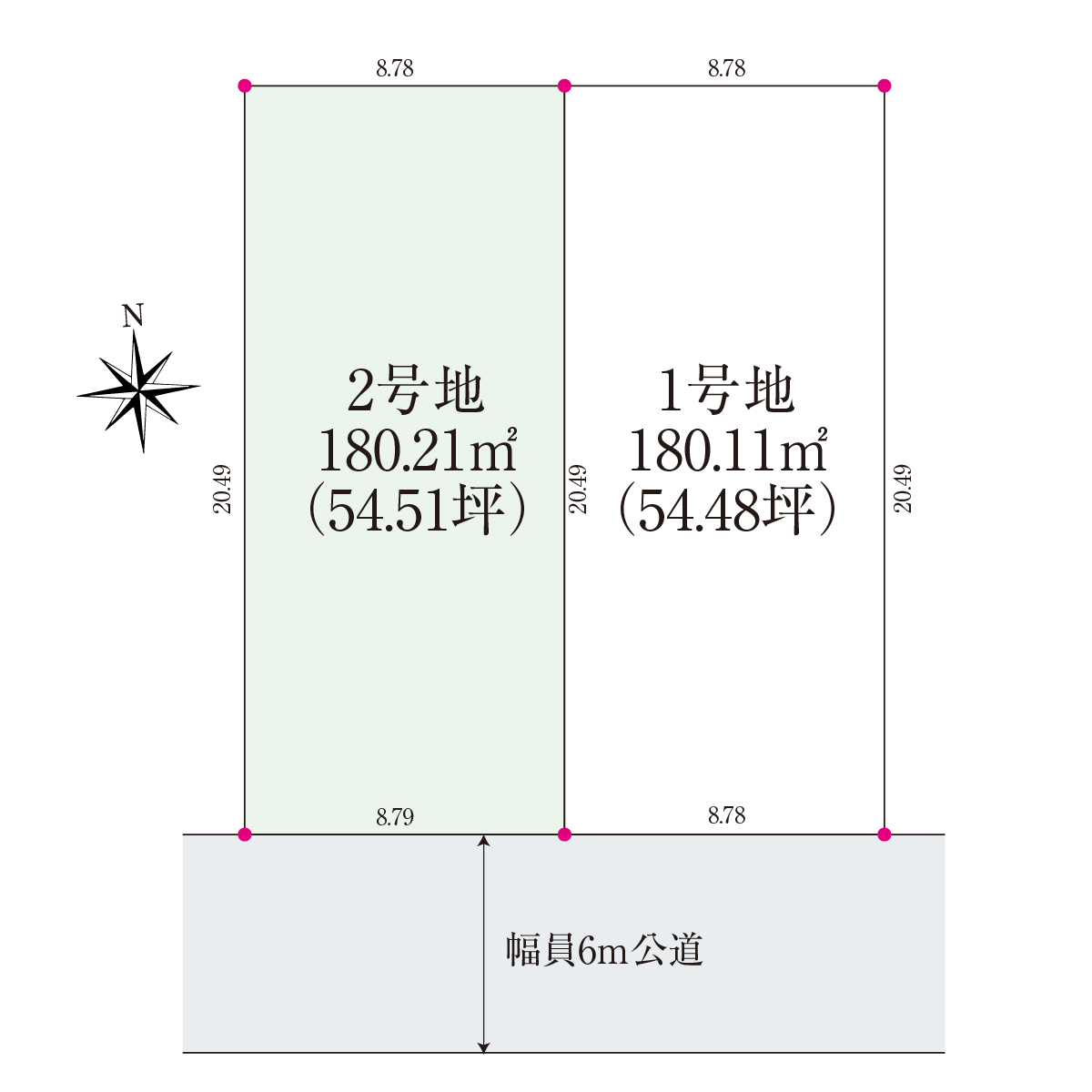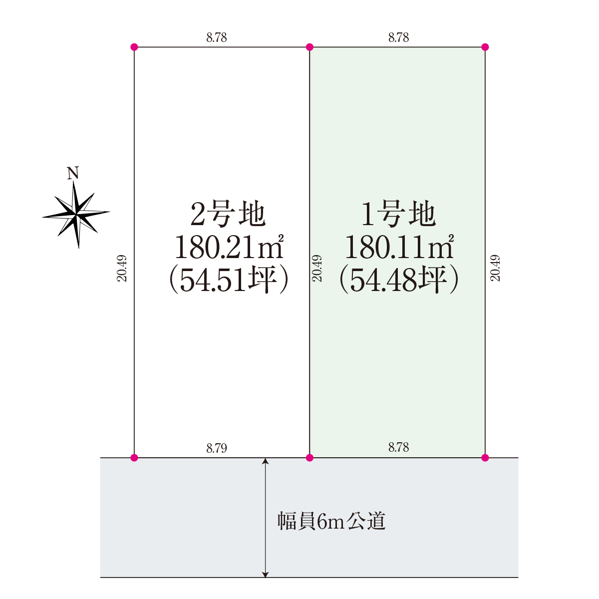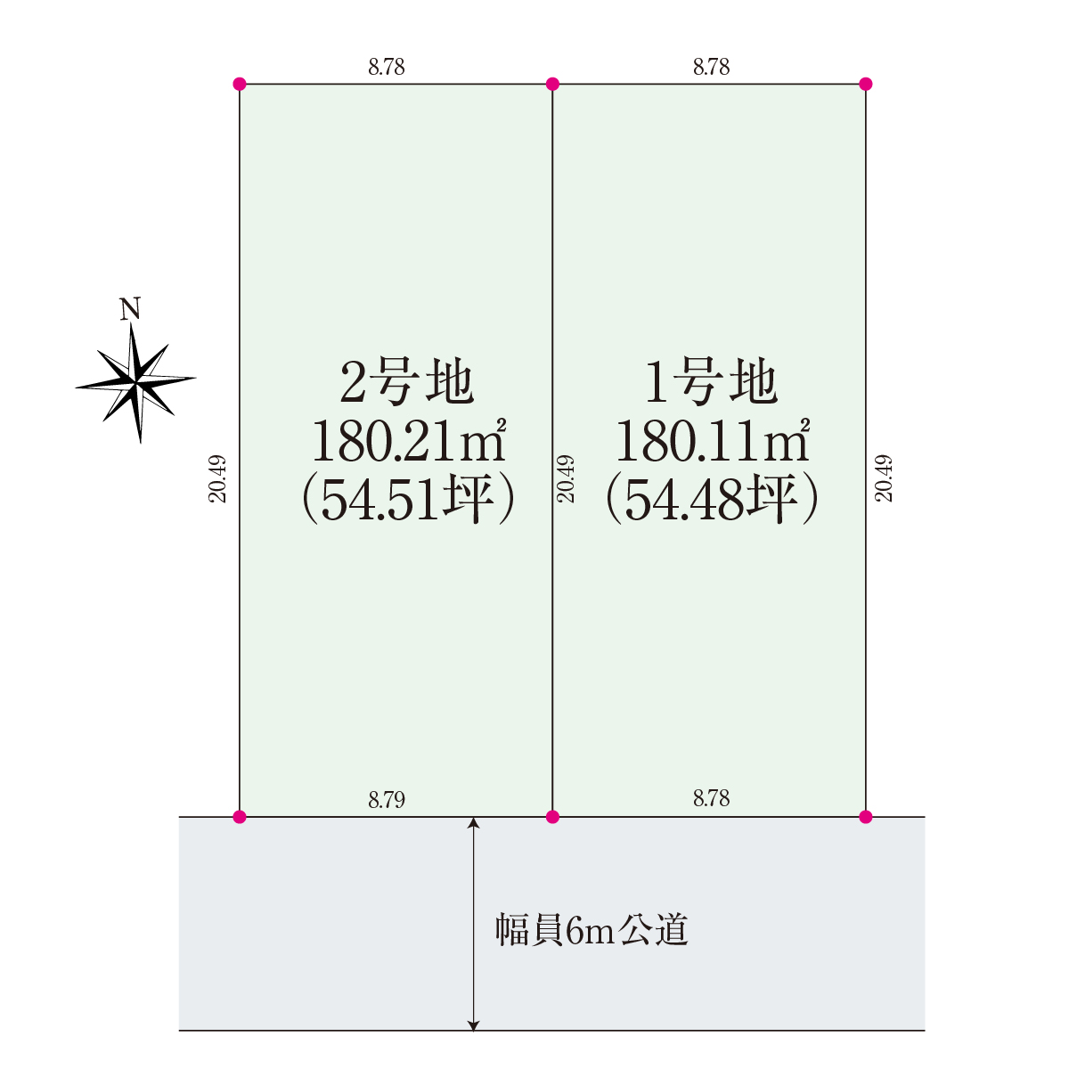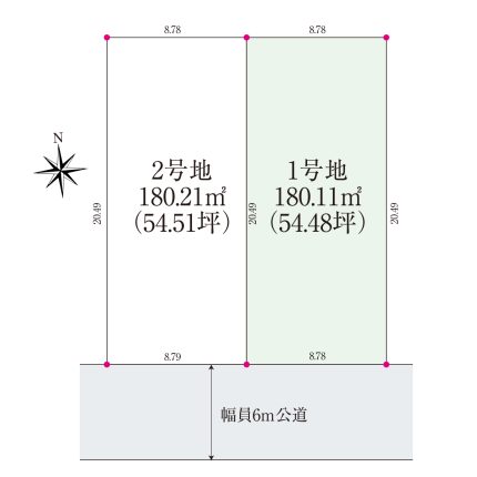 | 土地面積 | 180.12㎡(54.48坪)〜180.24㎡(54.52坪) |