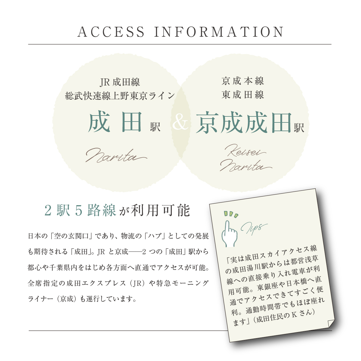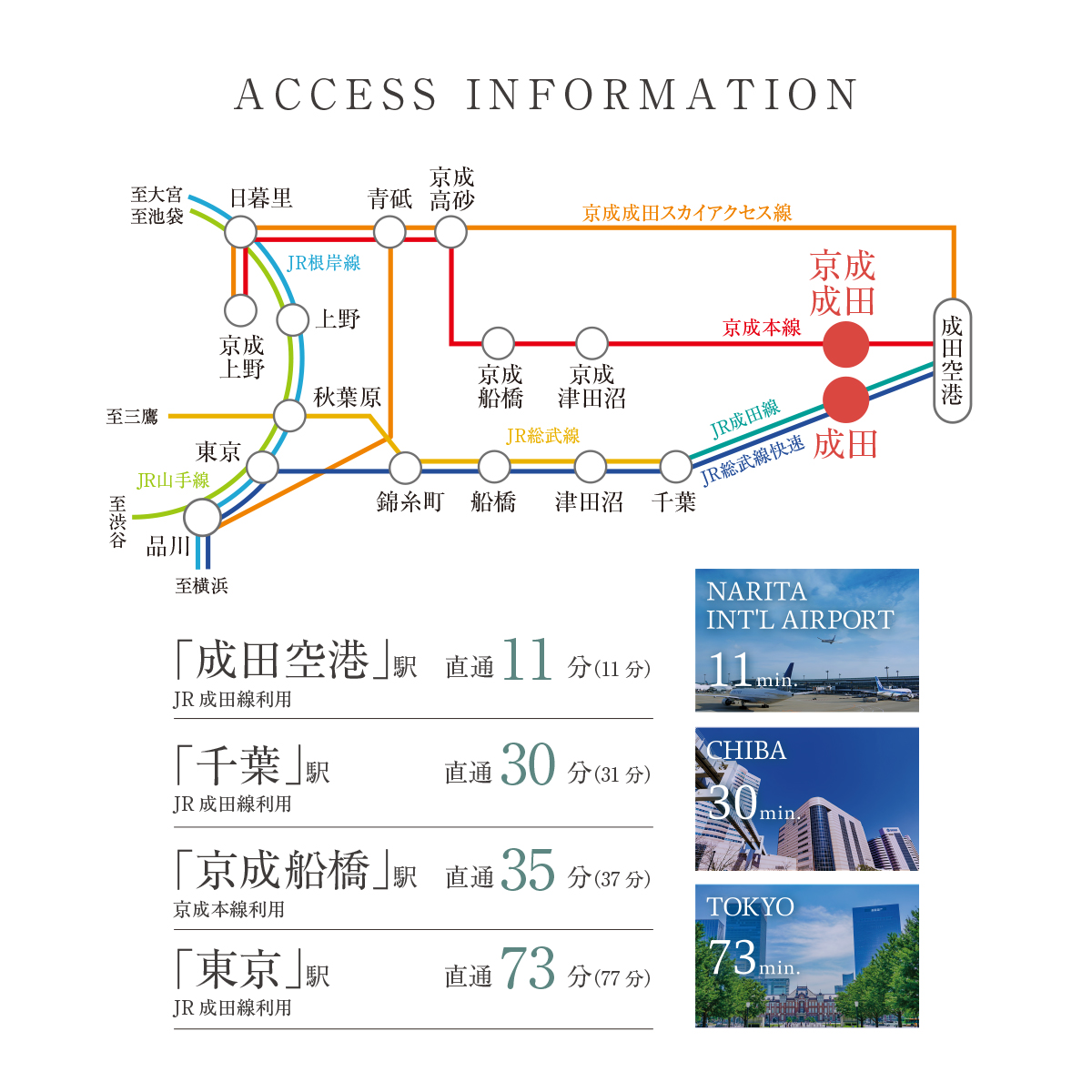 「 成田」駅から「千葉」駅へ30分。「成田空港」駅まで11分。2駅5路線が利用可能。