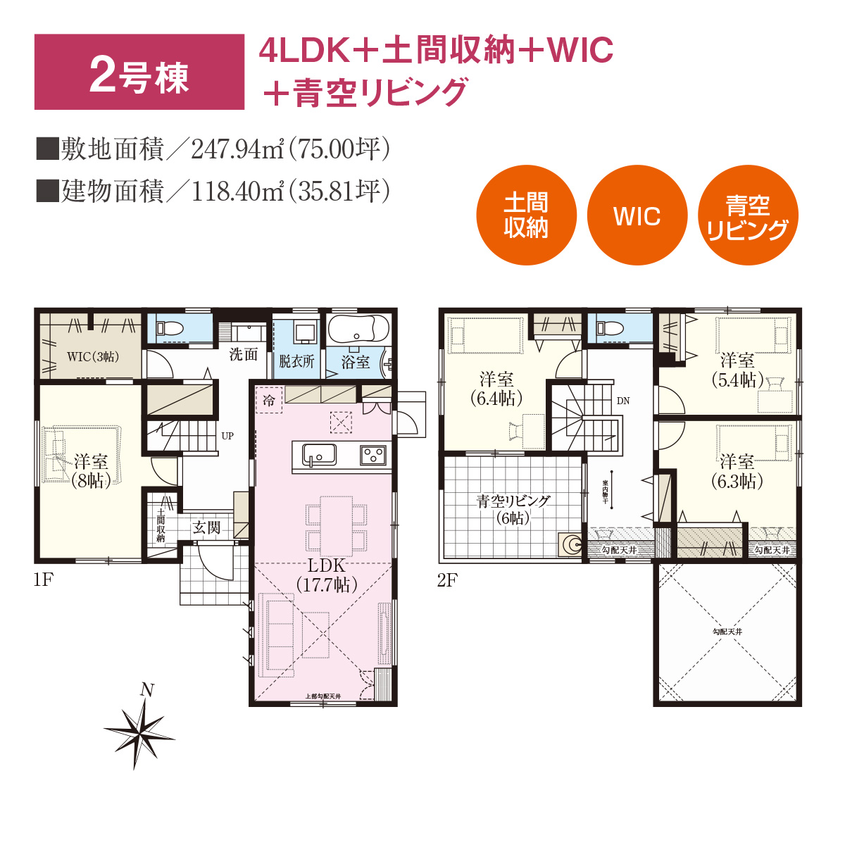 | 1号棟 | 4LDK+土間収納+WIC+青空リビング | 247.94 | 75 | 118.40 | 35.81 | 3,980万円 | ||