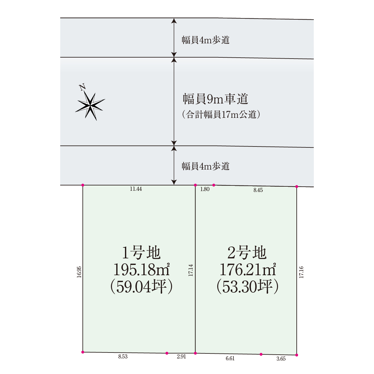 | 土地面積 | 176.21㎡(53.30坪)〜195.18㎡(59.04坪) |