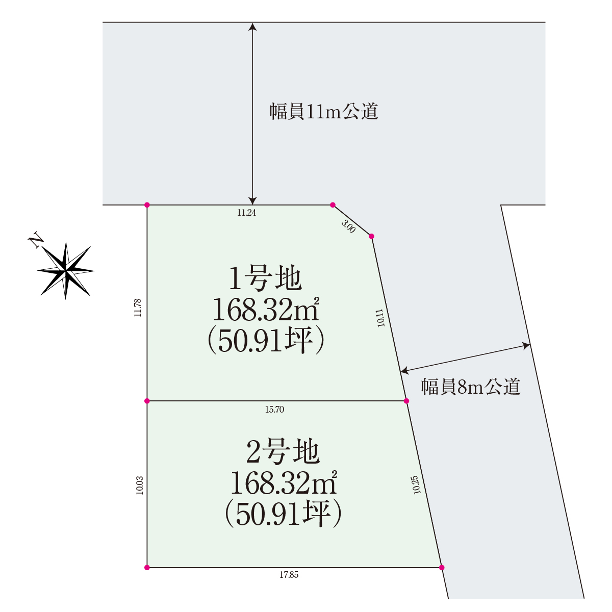 | 道路の幅員 | 南東側8m公道、北東側11m公道 |