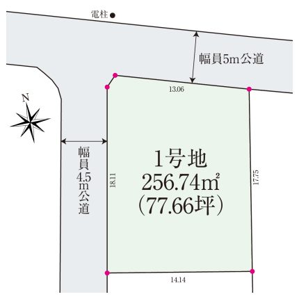 | 道路の幅員 | 北側5m公道、西側4.5m公道、南側1.2m私道(私道負担無) |