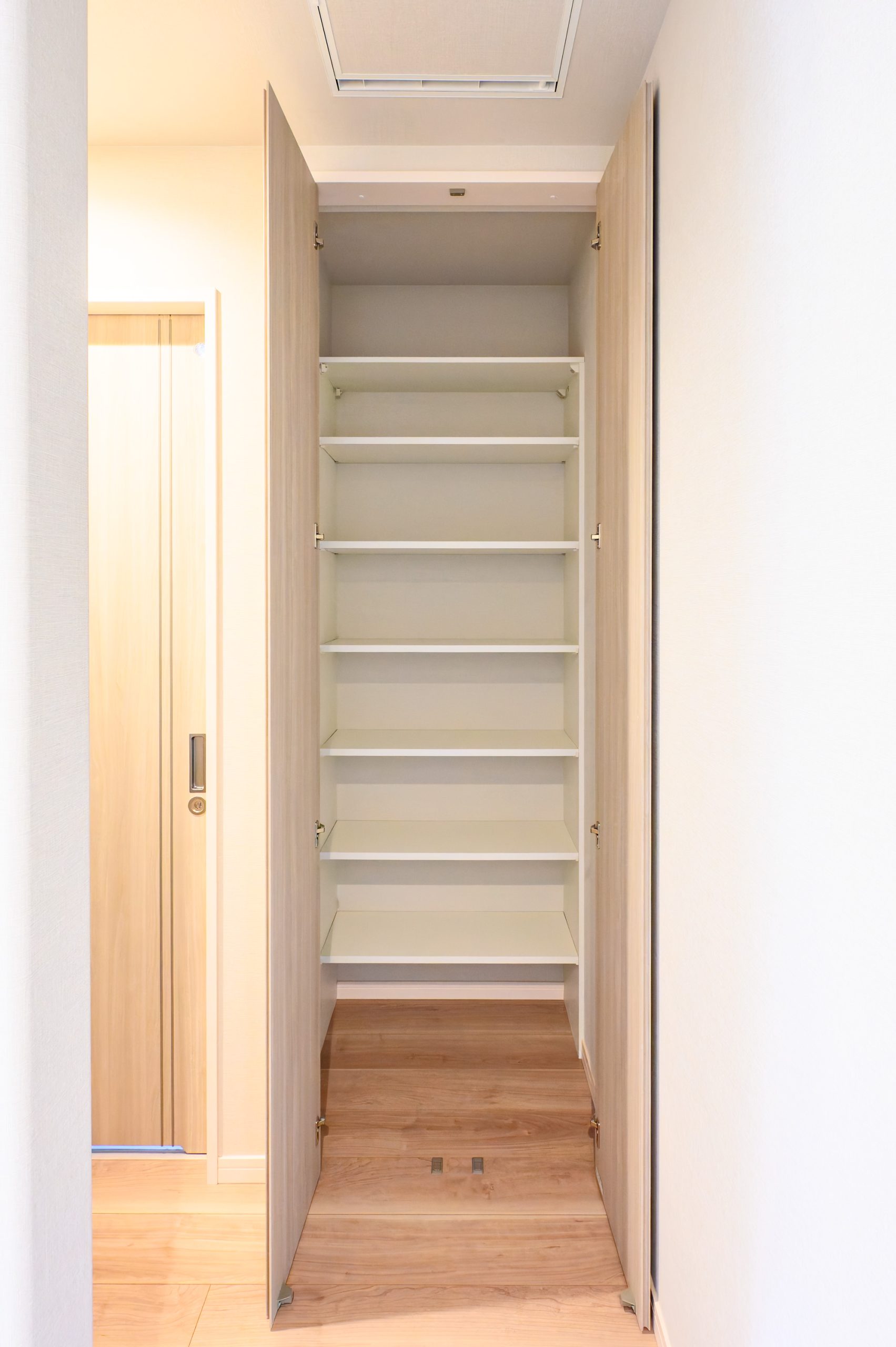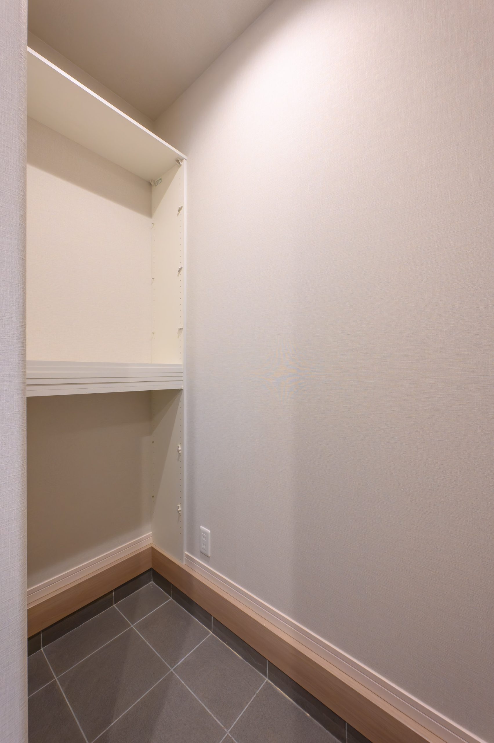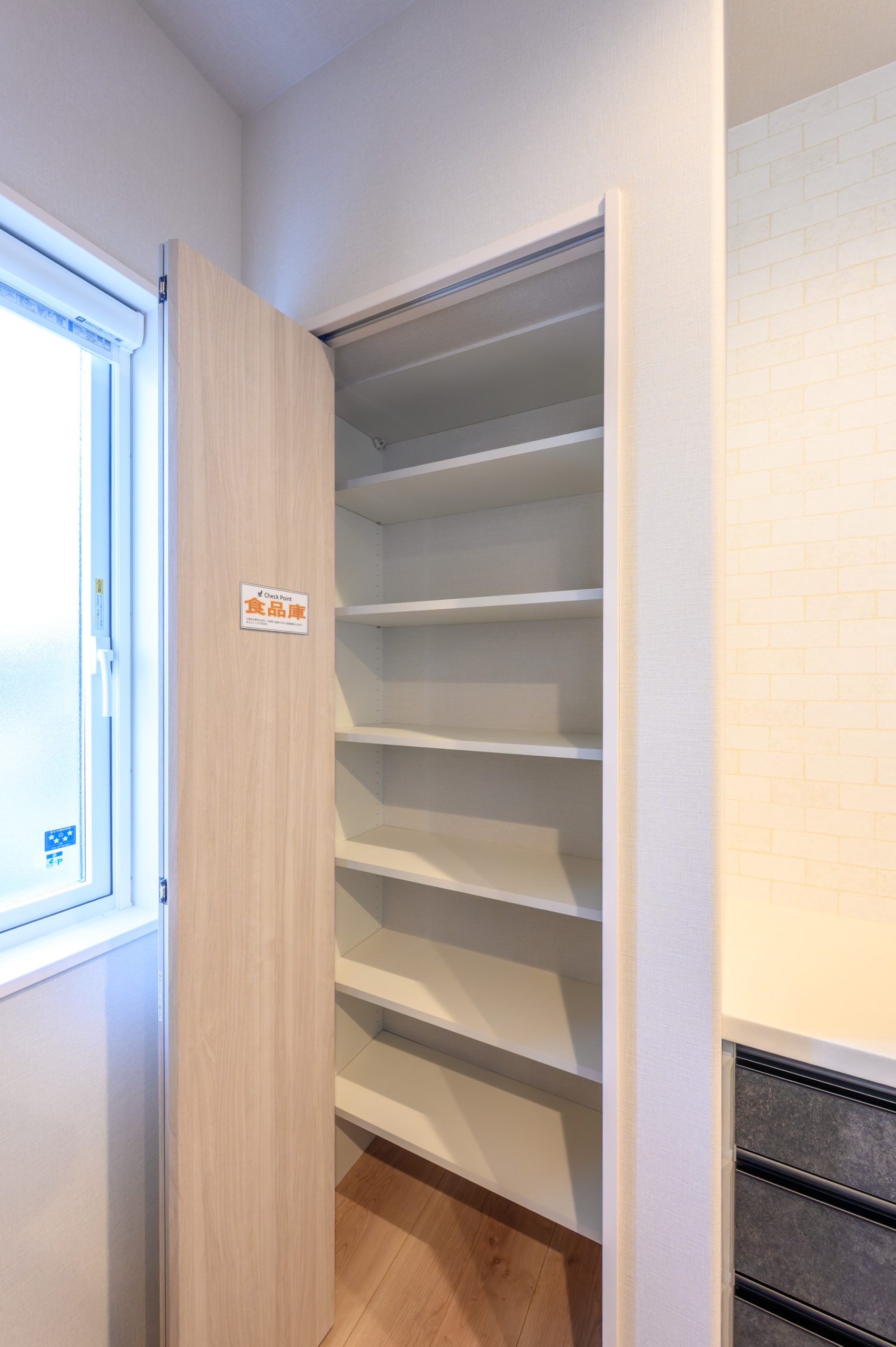 食品や日用品のストックに便利なスペース。可動棚で収納するものに合わせて高さを調節できます。