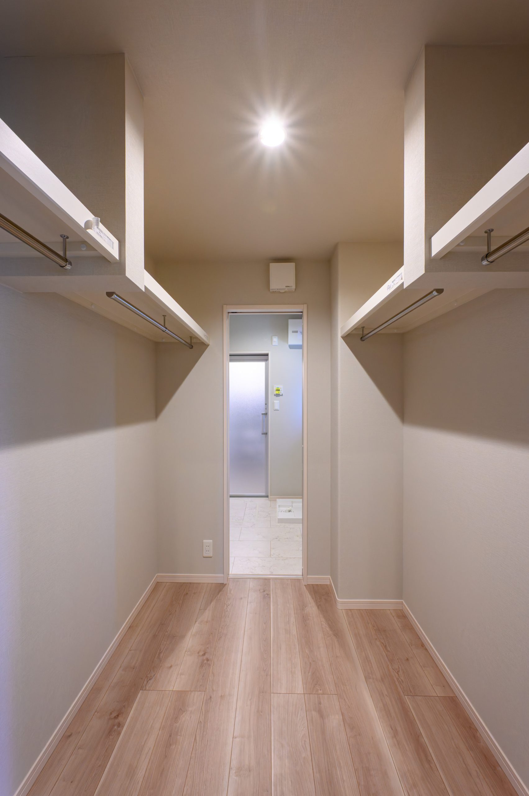 ウォークインクローゼットは大容量の収納を可能にします。ご家族の大切な衣類等はこちらにすっきり収納。玄関から脱衣室・洗面台まで繋がっており、帰宅動線良好です。