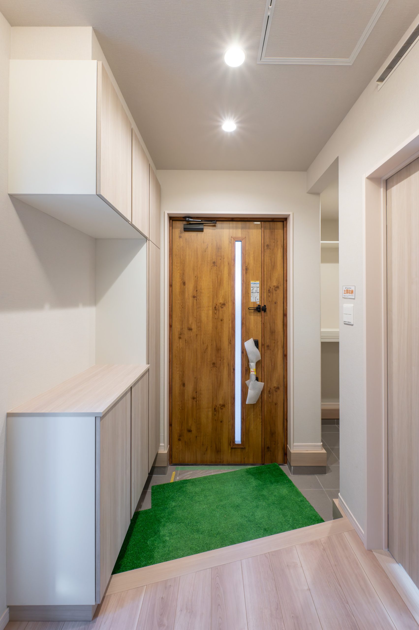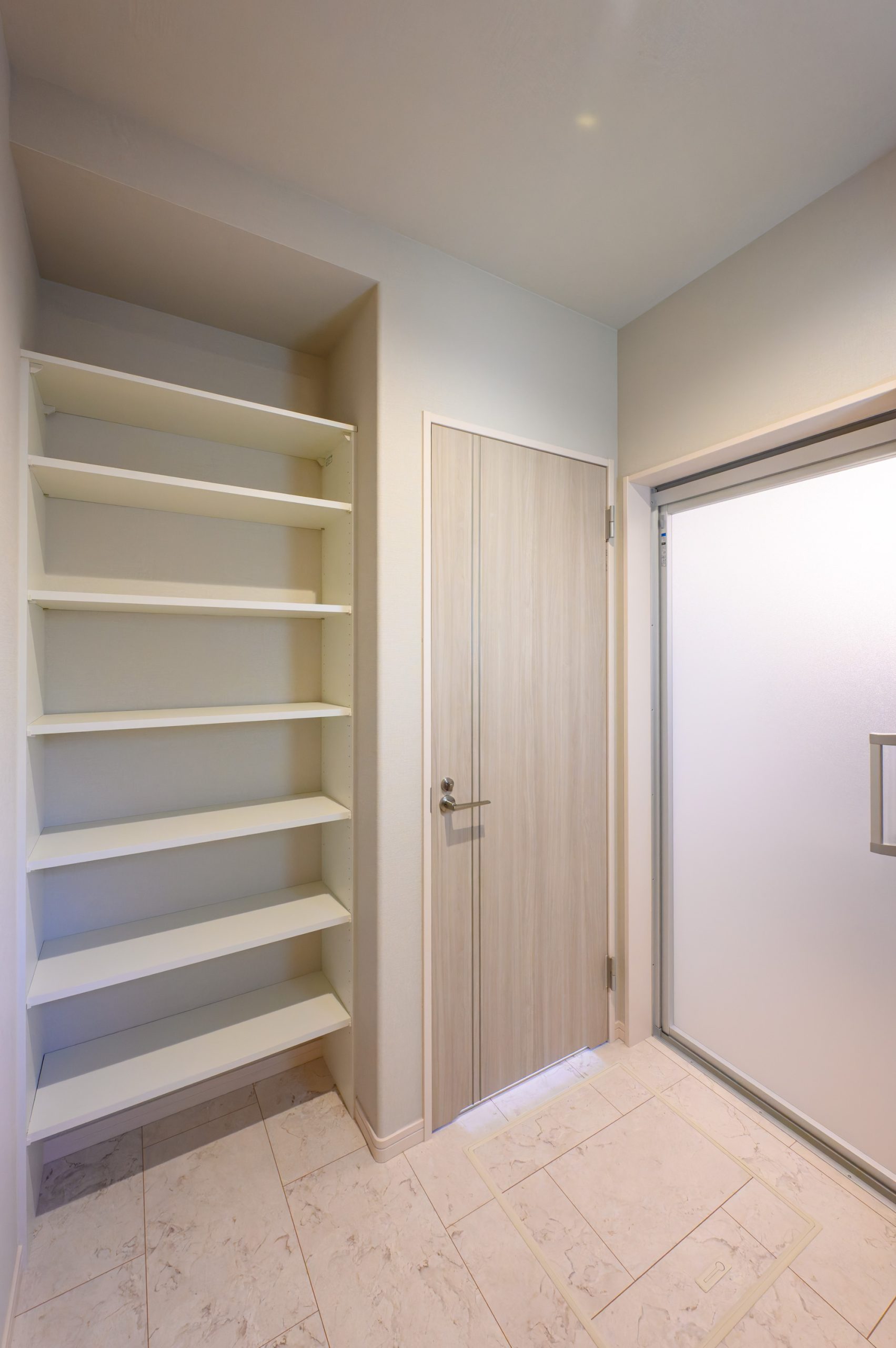 シューズボックスの棚に小物を置いて楽しめます。玄関を入ってすぐにWICがあるため、上着やコートなどの収納に便利です。