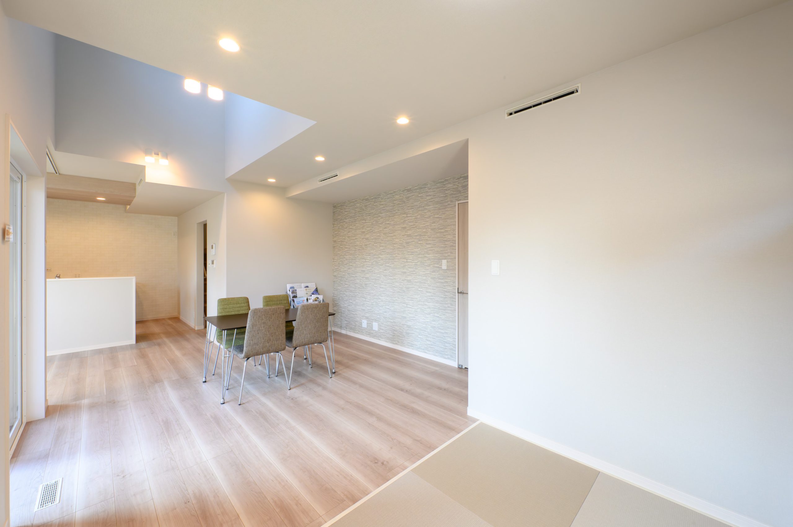 吹抜けが開放感を演出する約16.7帖のLDK。お子様のお昼寝スペースや家事室にも利用できる約3帖のタタミコーナーが隣接しています。全居室収納の他、小屋裏収納も備わっています。