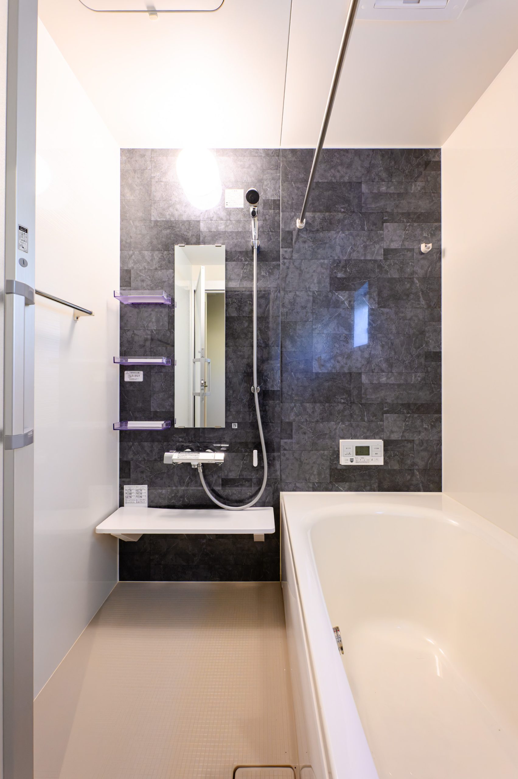 洗面室と分離されているため、家族や来客の洗面台の使用を気にせずにご入浴が可能です。棚もあるので、リネン類の収納にも便利です。