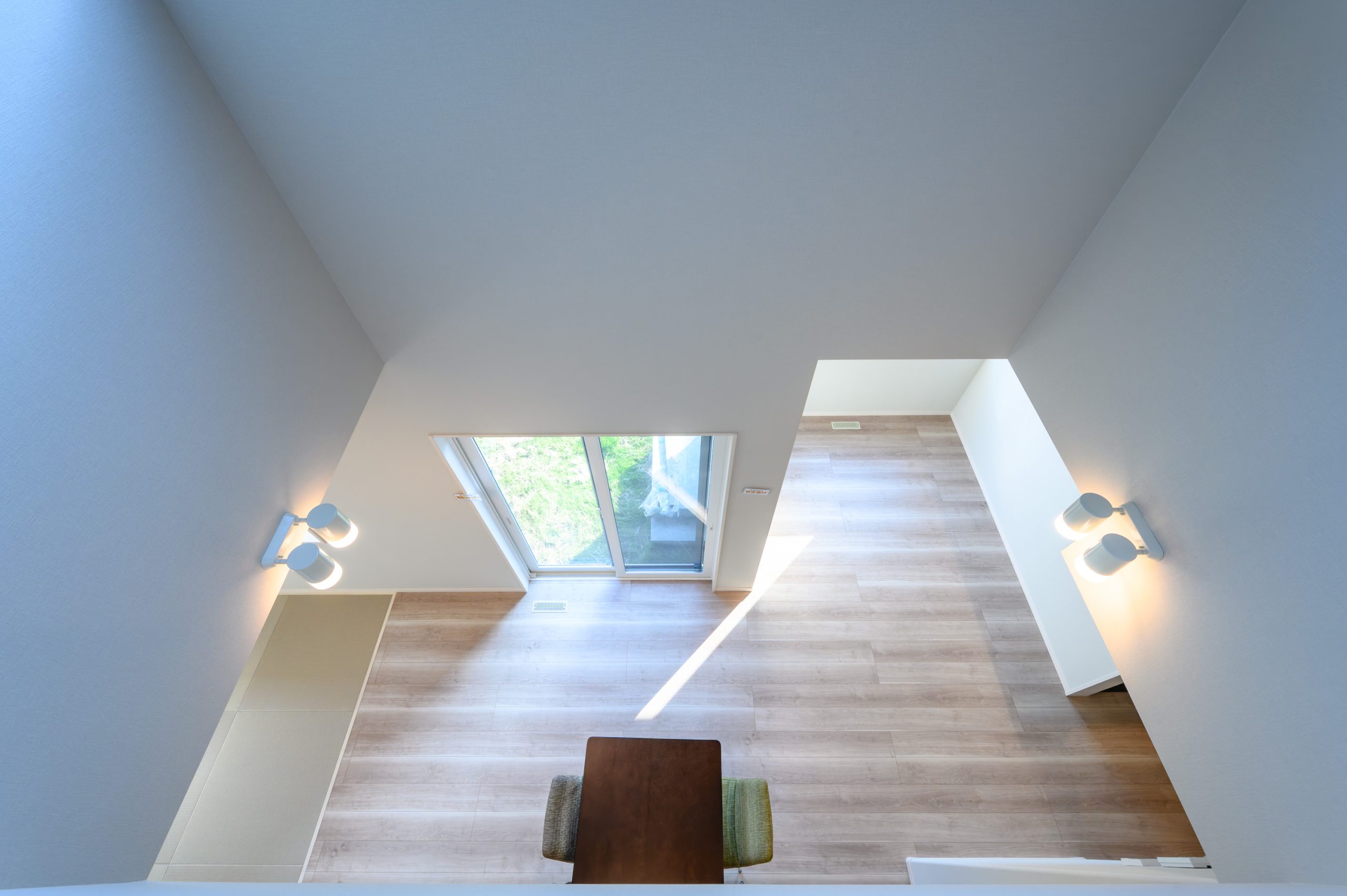 間接照明が空間に温かみを与えてくれます。吹抜け部分にも窓を設けているので陽光が差し込みます。