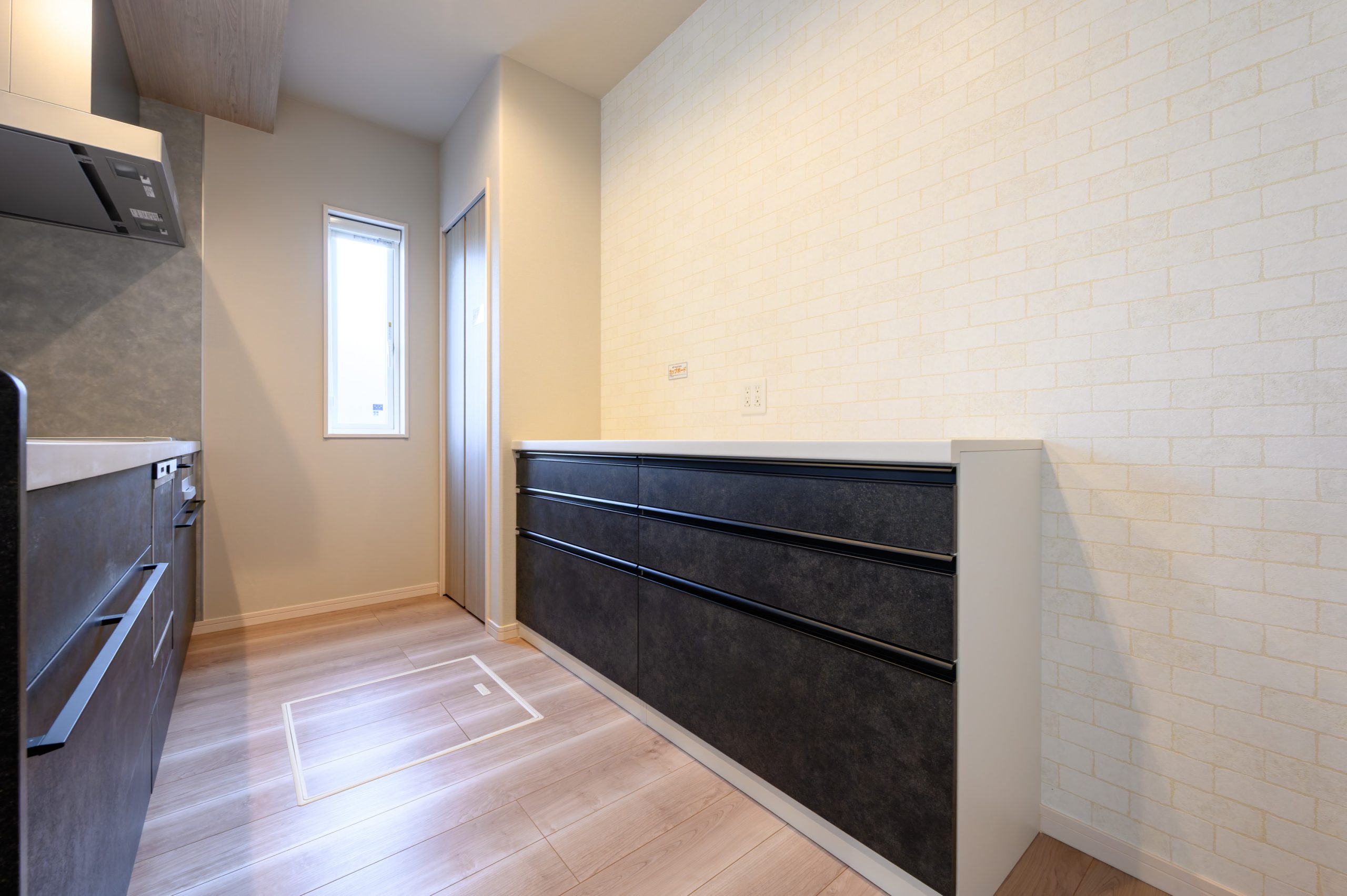 背面にはカップボードが備え付けでございます。食器やキッチン家電・調理器具等もすっきり収納でき、キッチン周りを常に綺麗に保てます。