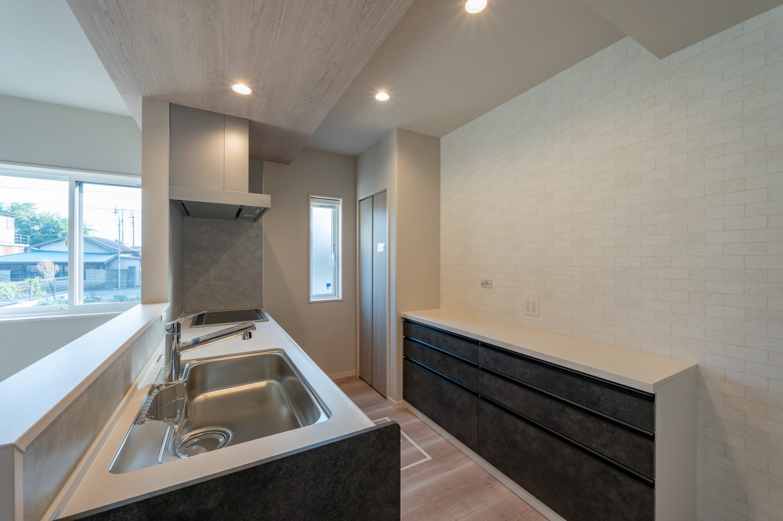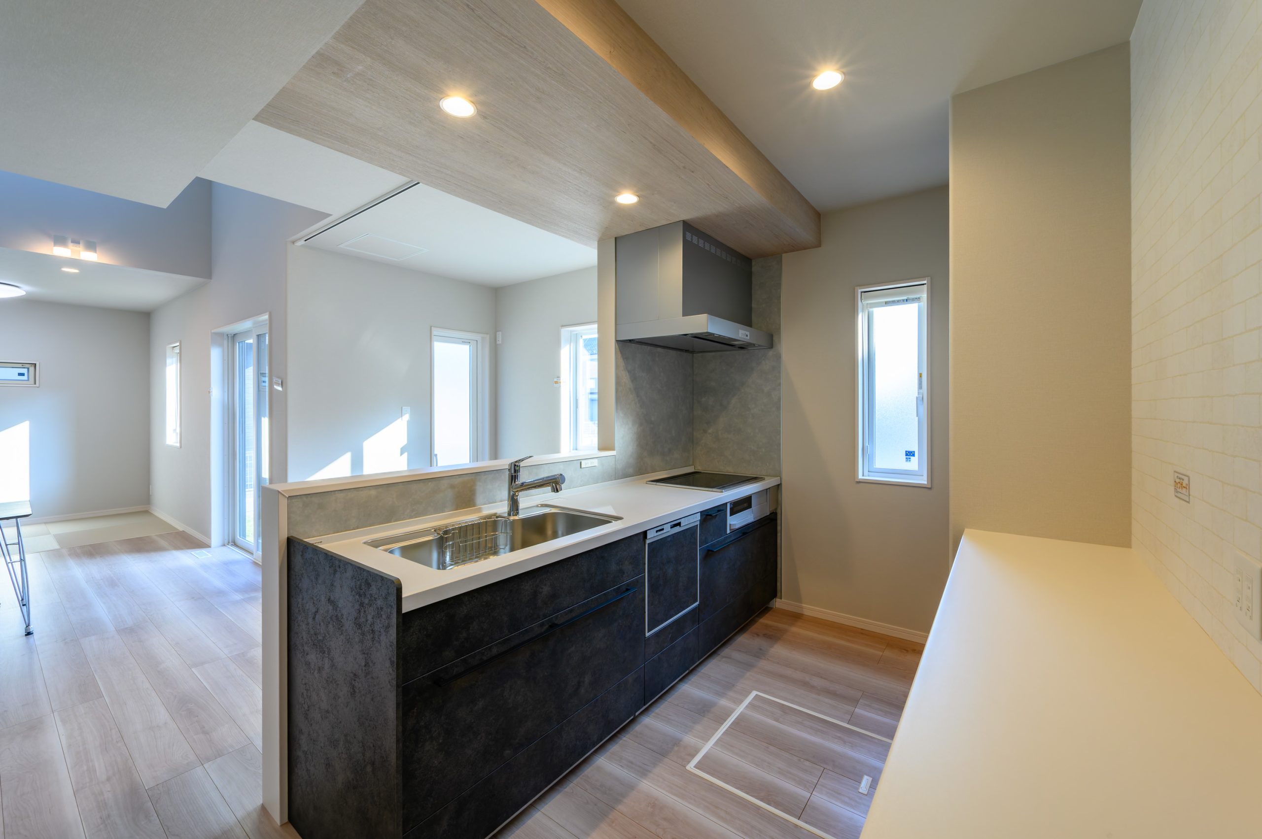 吊戸棚がなく開放感のあるキッチン。ナチュラルな雰囲気のリビングダイニングにシックな印象の黒を基調としたカラーで空間を引き締めてくれます。