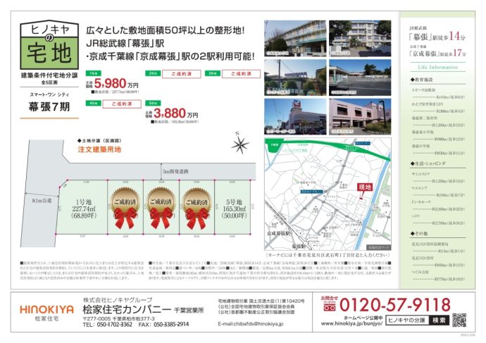 ☆★建物条件付土地 幕張7期★☆ 人気の武石町エリアに広々とした敷地面積50坪以上の整形地! JR総武線と京成線の2駅利用可能! ※現在1号地申込済になります。 いつでもご見学可能です♪ ご予約、お問合せは下記展示場までお願い致します。 スタッフ一同、心よりお待ち申し上げます。