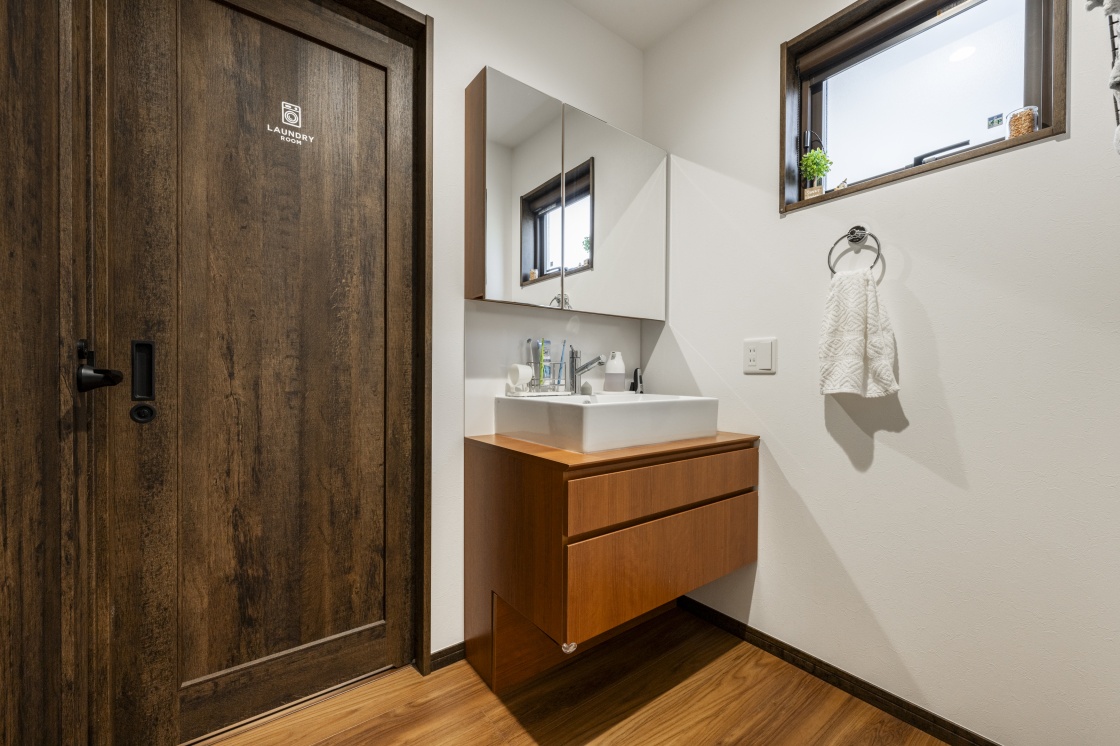 ウッド調の床は濃い挽き板をチョイスし、ドアやインテリアとの親和性を高めています。テレビ裏の壁にはベージュカラーのエコカラットを使用し、ところどころにアンティークな小物を配置することで、ビンテージ感のある落ち着いたLDKが完成しました。また、大きな窓を採用したことで自然光が取り入れやすく、ダイニングとキッチンの家事動線もスムーズになっています。