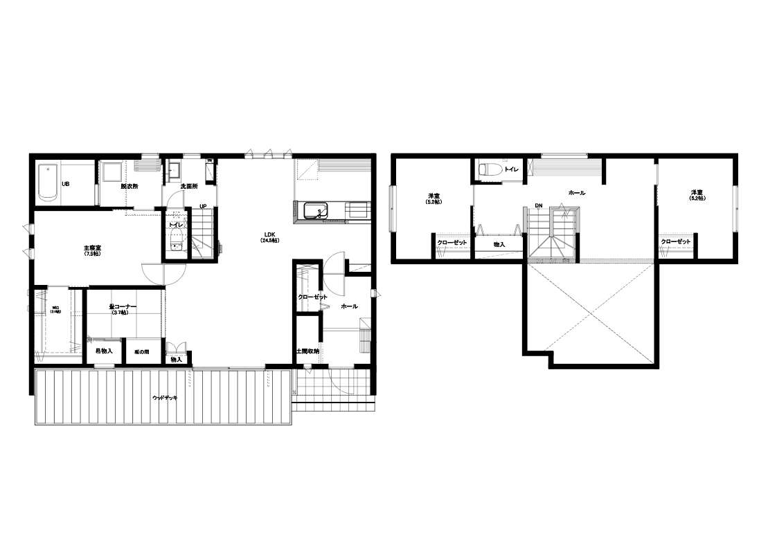 2階は多目的に使えるスペースとして設計されており、お子さんの成長に合わせて子供部屋として利用することも可能です。また、ワークスペースやリラックスできるソファを配置し、1階と2階が繋がった空間を感じることができます。