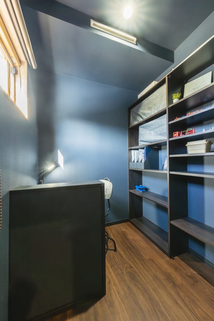 深いブルーの壁紙と木目調の棚が落ち着いた雰囲気を醸し出します。
