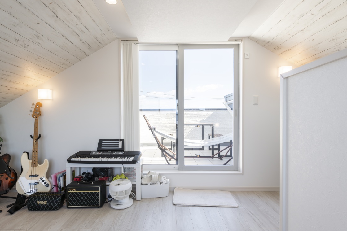 H様が特に気に入っているのは、このアトリエから青空リビング(屋上テラス)へ気軽に行き来できる動線。室内での創作活動と、屋外での寛ぎを自由に行き来できる設計が、日常に新たな豊かさをもたらしています。