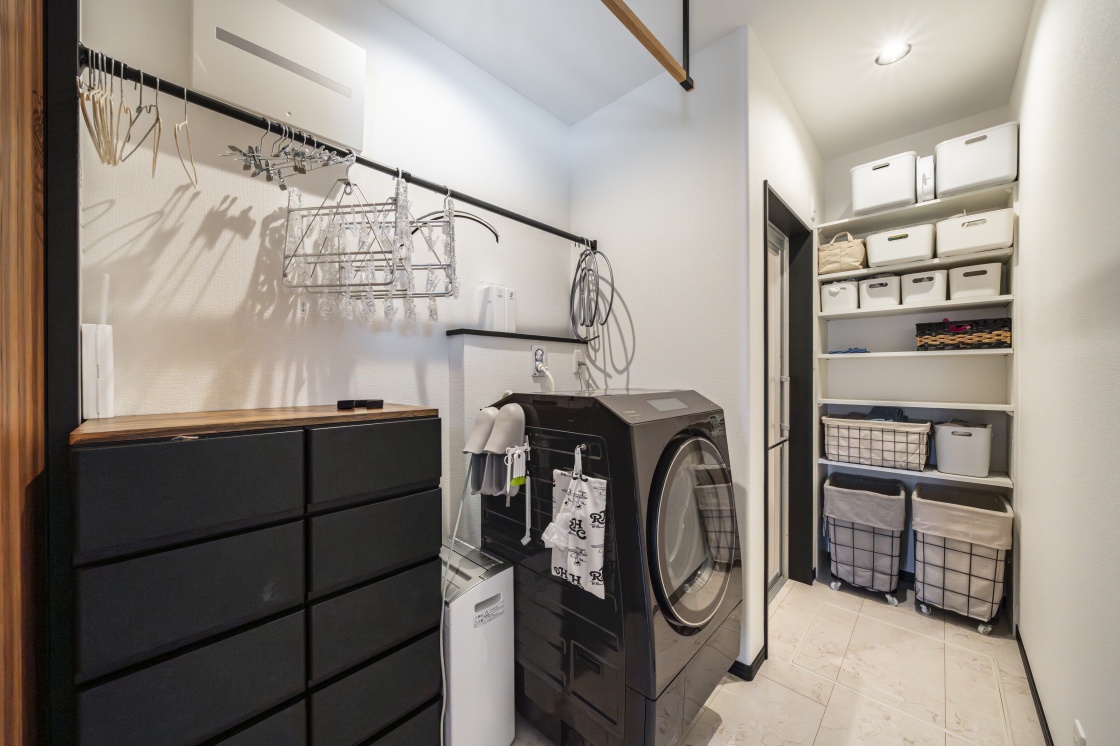 天井からはハンギングバーが設置され、室内干しもスムーズに行えるよう配慮されています。また、奥には収納棚を設け、白いボックスを統一して使うことで視覚的にもすっきりとした印象に。