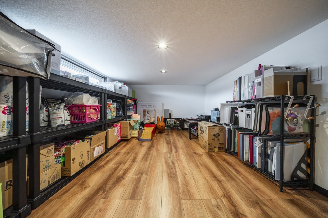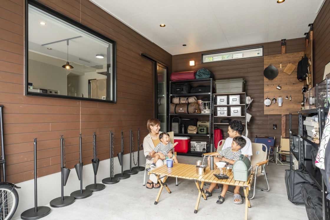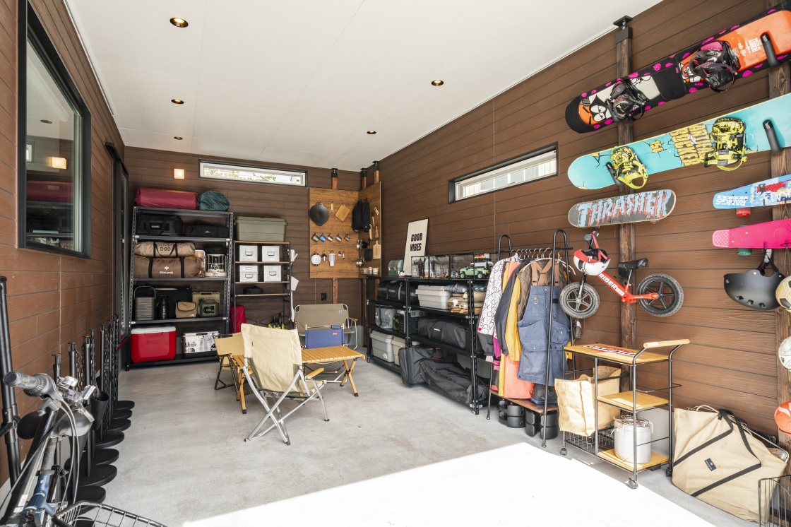 リビングの窓からはガレージ内を眺められる設計となっており、家の中から家族の様子を確認することができるのもポイント。雨や雪の日でもBBQやスポーツを楽しめる屋内スペースとして、また趣味の時間を過ごす特別な場所として、家族の暮らしに新たな楽しみをもたらしています。