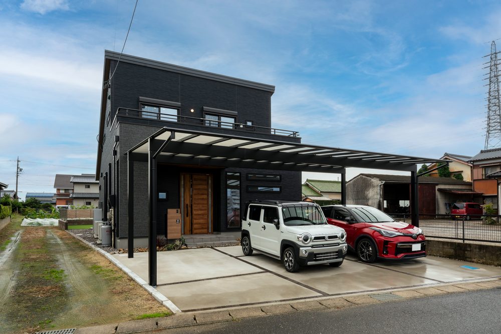2階に設けられた青空リビングのバルコニーは、建物のシルエットにリズムをもたらし、外観の単調さを防いでいます。大きな開口部からは十分な光が室内に取り込まれ、クールな黒い外壁でありながら、内部は明るく開放的な空間となっています。