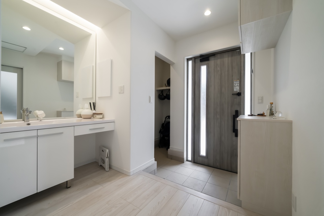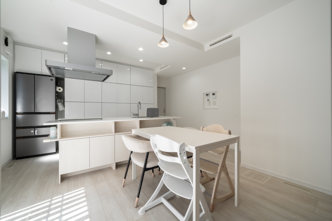 O様の家づくりで特にこだわったのは「明るさ、吹き抜け、キッチン」の3点。光あふれる開放的な空間と、使い勝手の良いキッチンを中心に据えた間取りが、O様ご家族の理想の住まいを形作っています。お子様と共に過ごす時間を大切にできる、明るく温かみのある住空間が完成しました。