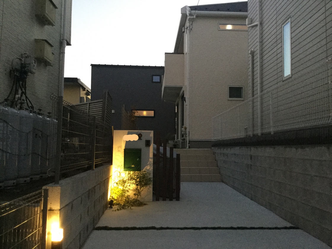 間接照明を活用した外構も雰囲気が良く、人工芝のお庭もきれいです。