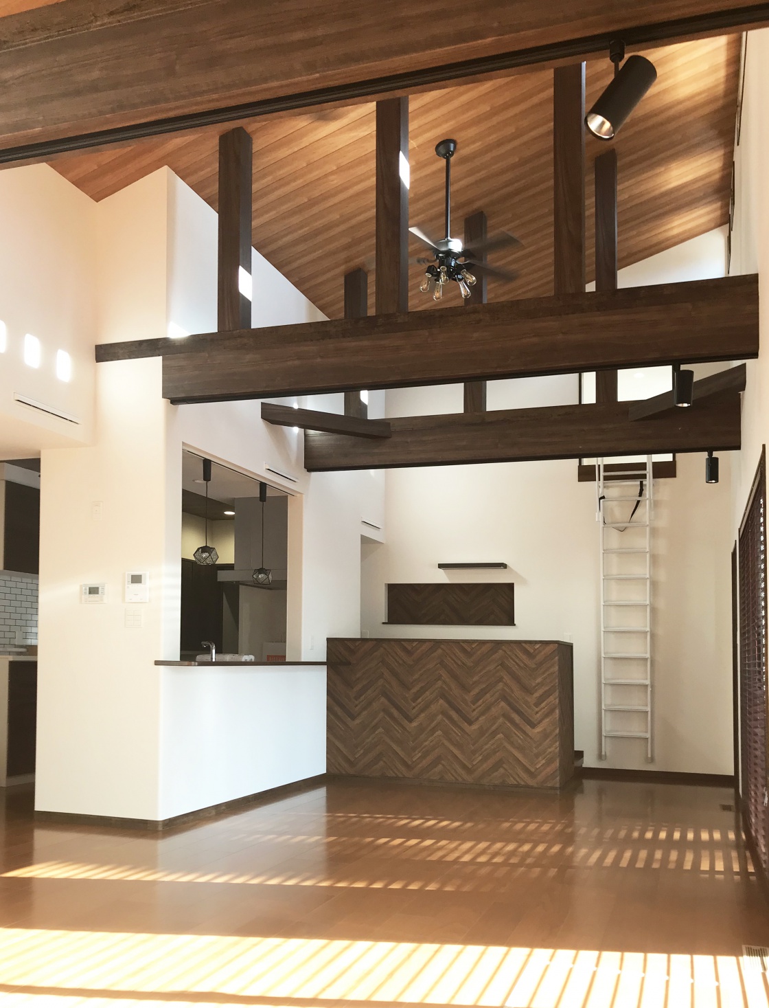 ・広いLDKの上部は大きな吹き抜けと遊び心のあるガレージ・小屋裏収納展示場名