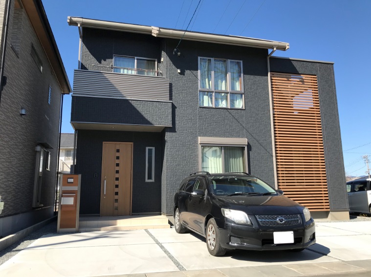 外観の横格子がアクセントになっています。内装のセレクテリアセブンはカリフォルニアビンテージとニューヨークビンテージを採用されました。