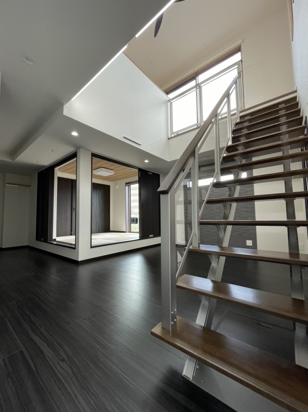 吹抜け天井とオープン階段があり明るく開放感を感じられるリビング。居心地の良いLDKは家族との時間をより豊かにします。